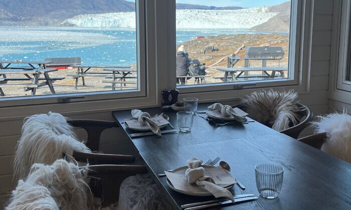 Her på lodgens hyggelige café kan du også nyde udsigten til Eqi gletsjeren. Et ophold på Glacier Lodge Eqi er inkl. helpension og alle måltider nydes i caféen.