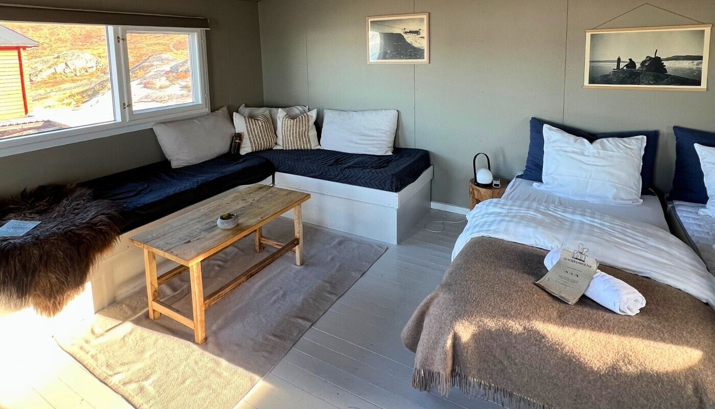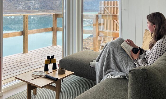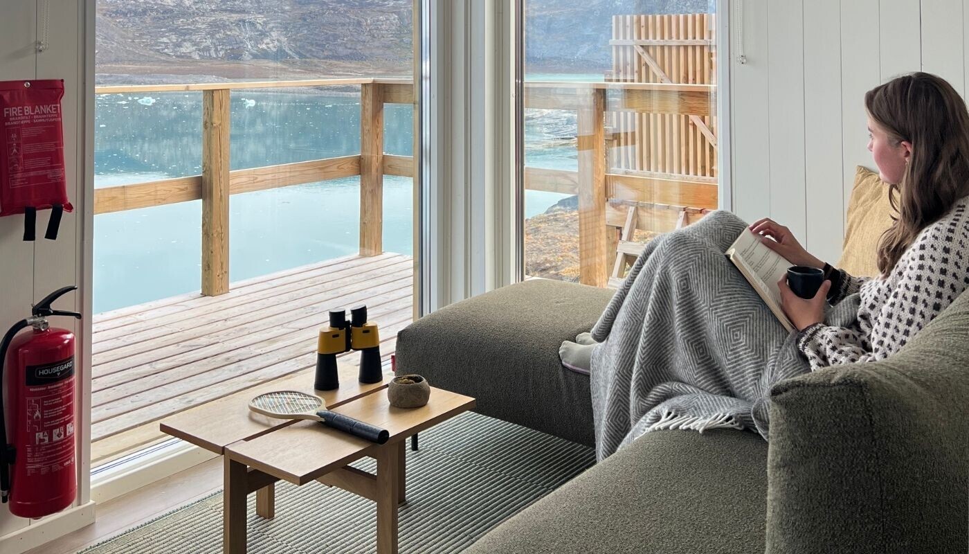 Alle komfort deluxe hytter er placeret med panorama vinduer med en fantastisk udsigt til havet og Eqi gletsjeren. Alle komfort deluxe hytter har egen terrasse, indlagt gulvvarme og eget bad og toilet.