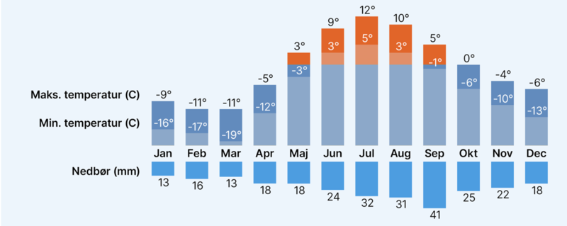 I februar er solen begyndt at vende tilbage efter vinterens mørke, og dagslyset vokser støt dag for dag. Temperaturen ligger som regel mellem -2 og -9 °C, og vejret er ofte klart og tørt – hvilket gør det ideelt for udendørs aktiviteter som hundeslæde, snescooter vandring. Landskabet er dækket af sne, og fjorden fyldt med is – det giver et dramatisk og storslået bagtæppe til rejsens oplevelser.