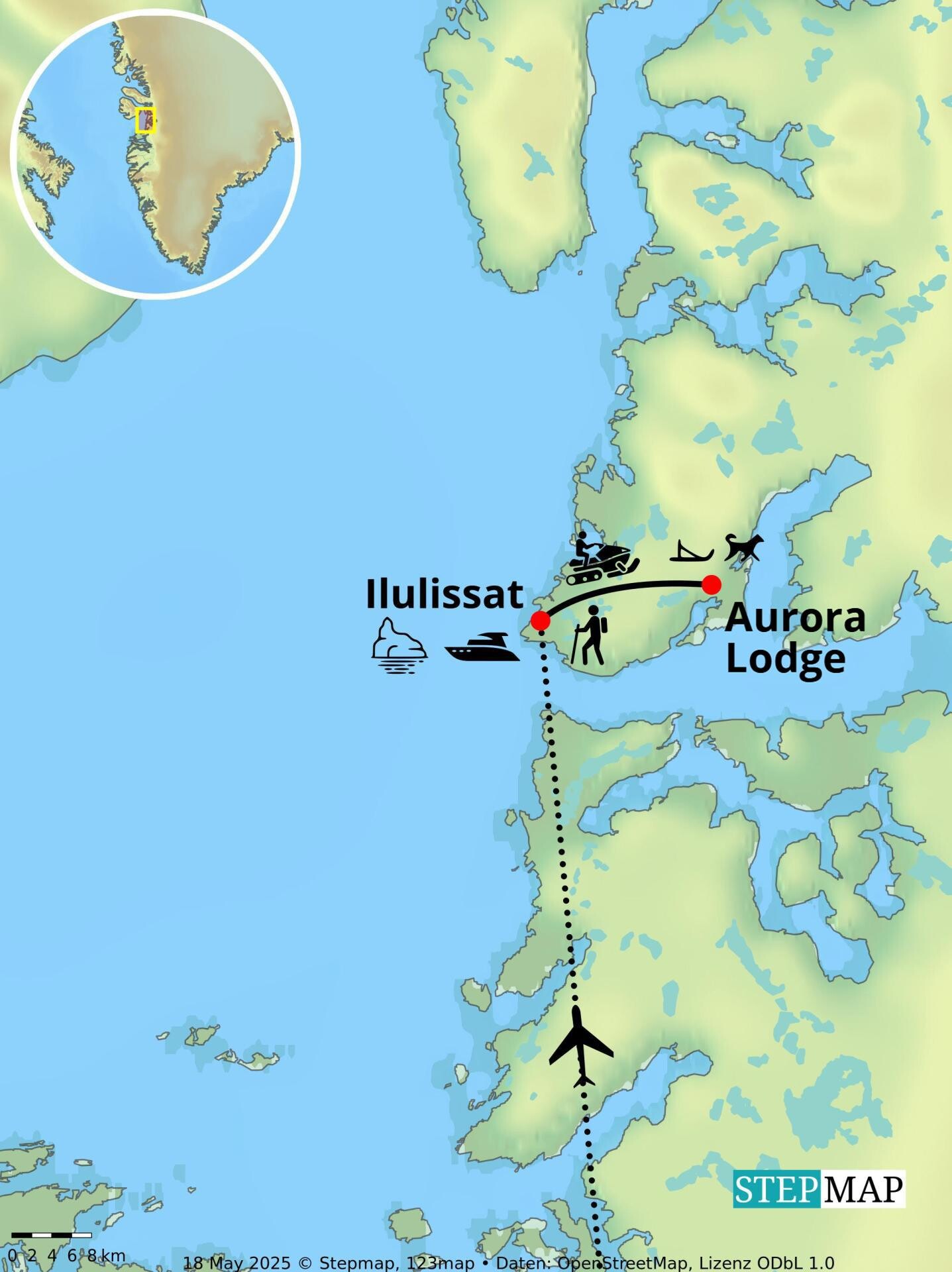 Flyveturen fra København til Nuuk med Air Greenland tager ca. 4½ time. Med god service og film på menuen går tiden hurtigt. I Nuuk skifter du over til et mindre fly, der tager dig til Ilulissat. Hotellets bus venter i Ilulissat Lufthavn og kører de 5-10 min. ned til Hotel Icefiord i byen. Gå en tur rundt i Ilulissat for et godt indtryk af livet i Arktis. Oplev for eksempel Zionskirken og Knud Rasmussens fødehjem, som i dag er byens lokalhistoriske museum.