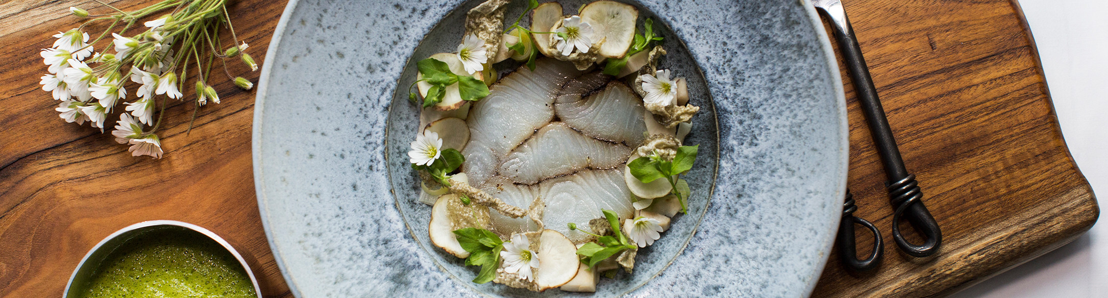 I sommerperioden (juni – september) udfolder den grønlandske flora sig i fuldt flor. I fjeldlandskaberne vælter det frem med vilde urter, såsom fjeldsyre, grønlandsposten, arktisk timian, samt en overflod af spisesvampe i de sene sommermåneder. Det kombinerer vi med urter, som vi selv dyrker, foruden nordiske grøntsager.