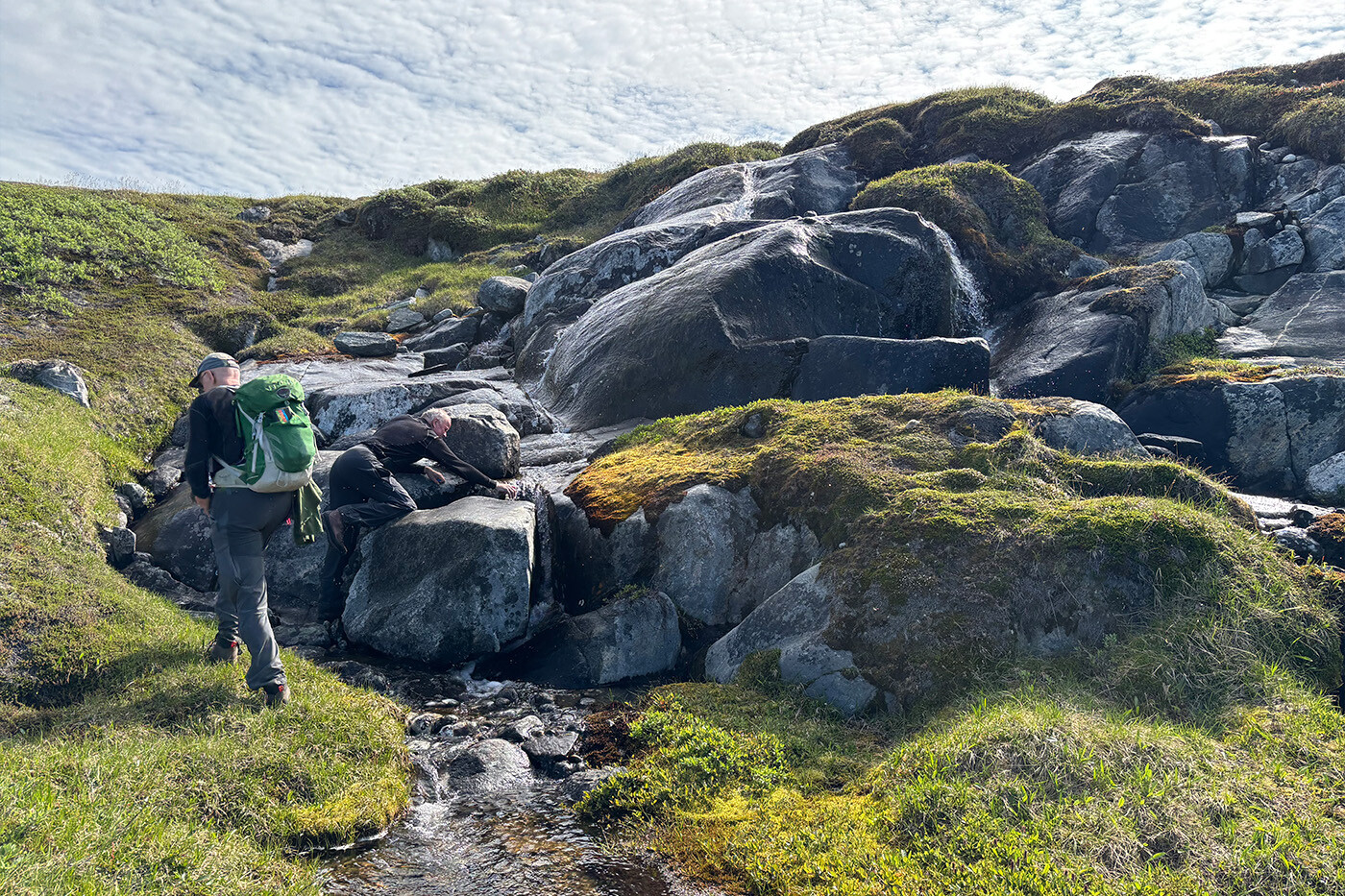 Ruten vi følger, er ikke ofte benyttet, og det gør oplevelsen desto mere særlig. Vi bevæger os gennem ægte fjeldterræn med åben tundra, kuperet landskab og vekslende underlag – nogle strækninger kan være fysisk krævende, men ruten er ikke teknisk svær. Stilheden og det rå, grønlandske landskab omgiver os hele vejen.