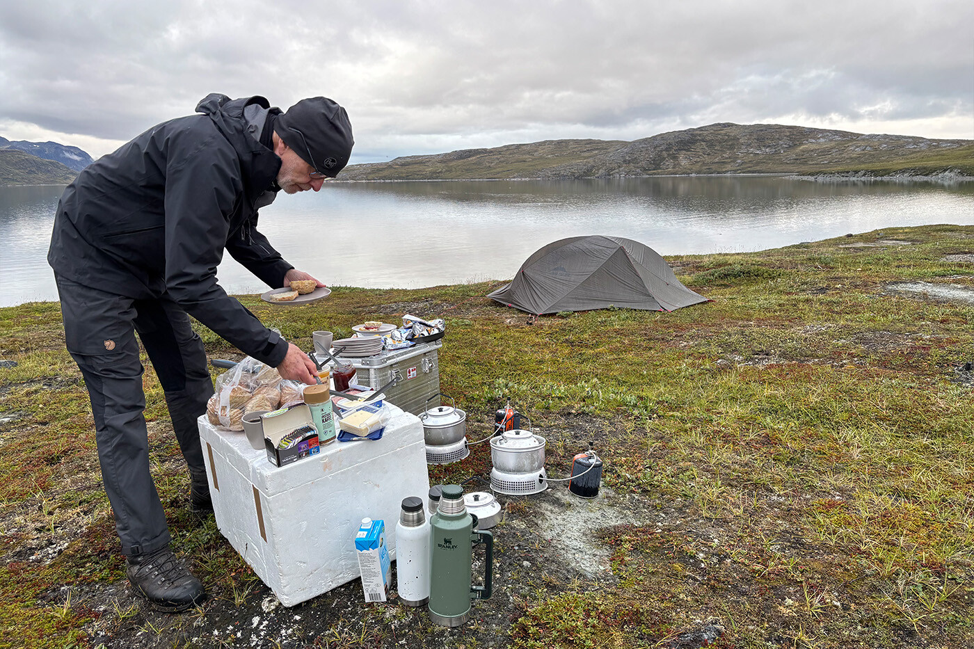 Den tunge bagage bliver sejlet fra hotellet til vores første lejrplads nord for Laksebugten, så vi kan nøjes med at bære vores dagstursrygsække med madpakke og det mest nødvendige til dagens tur. Det giver os frihed til at nyde vandringen og landskabet undervejs.