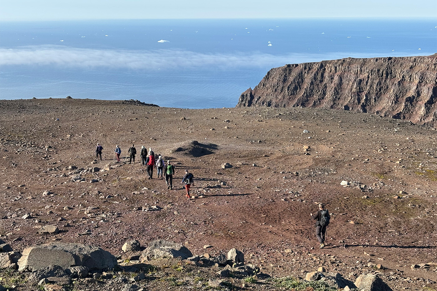 Vel fremme bliver vi belønnet med en storslået udsigt over hele Diskobugten. I klart vejr kan man se helt til isfjordsmundingen ved Ilulissat – næsten 100 km væk – og følge store dele af den rute, vi skal bevæge os rundt på de kommende dage.