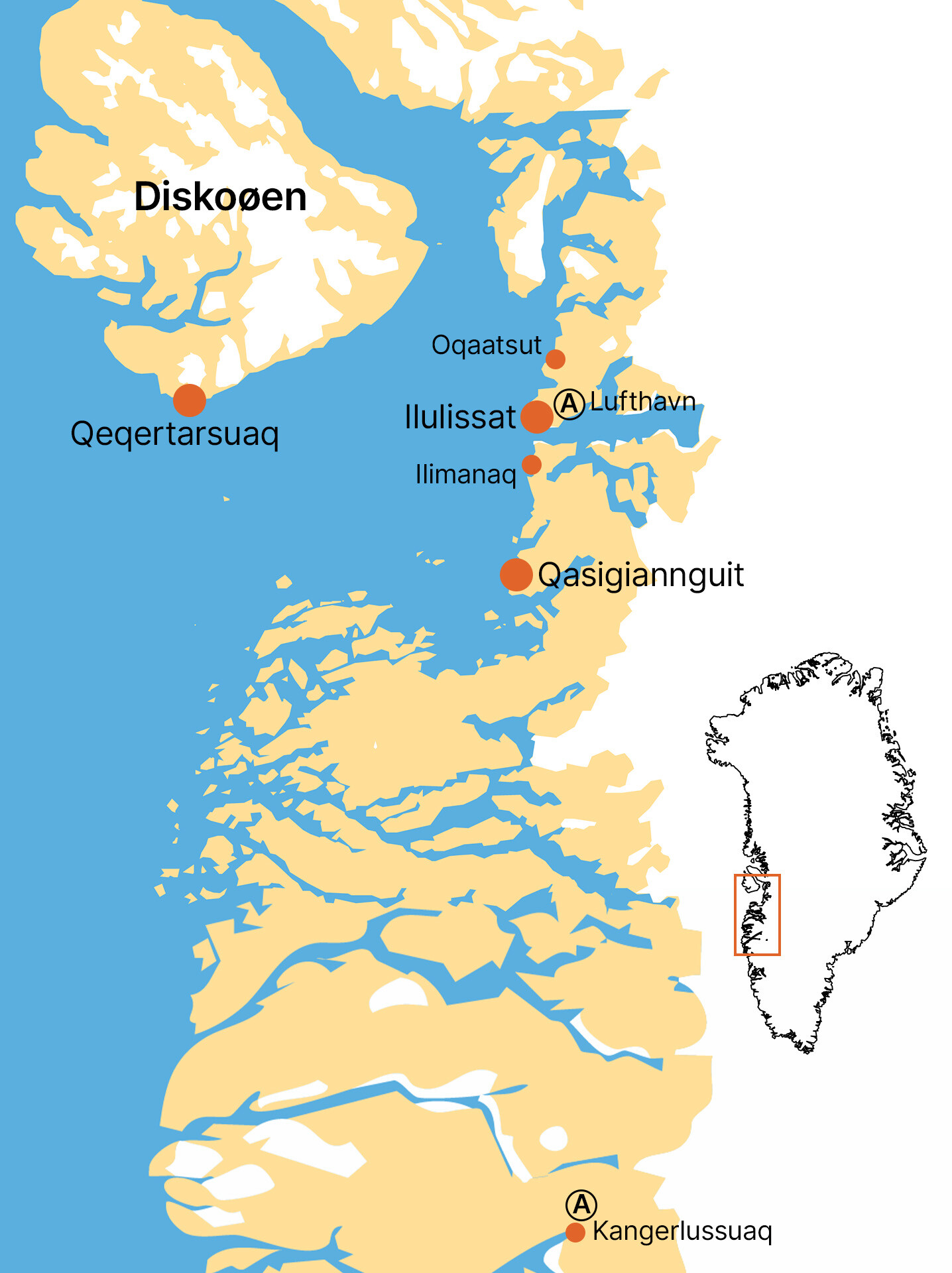 - Oplev den særlige stemning og bylivet i Kangerlussuaq, Qeqertarsuaq, Qasigiannguit og Ilulissat