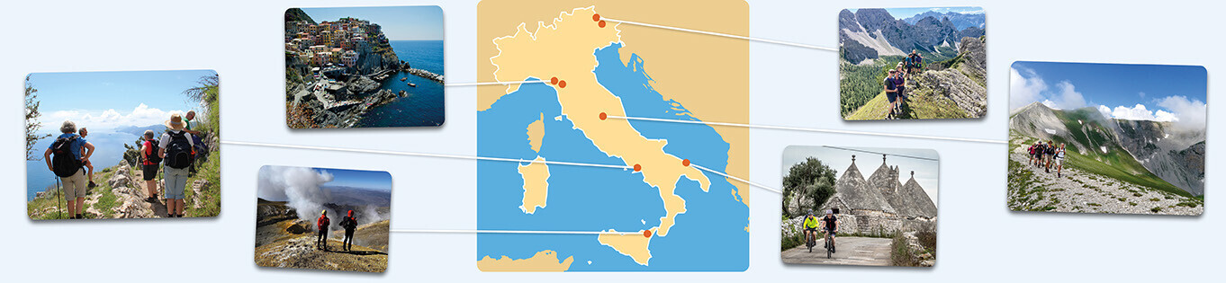 Oplev Italien med Topas på en aktiv ferie fyldt med vandring, trekking, cykling og kulinariske oplevelser. Topas har været i Italien i mange år og vi har et særdeles varieret udbud af rejser til Italien.