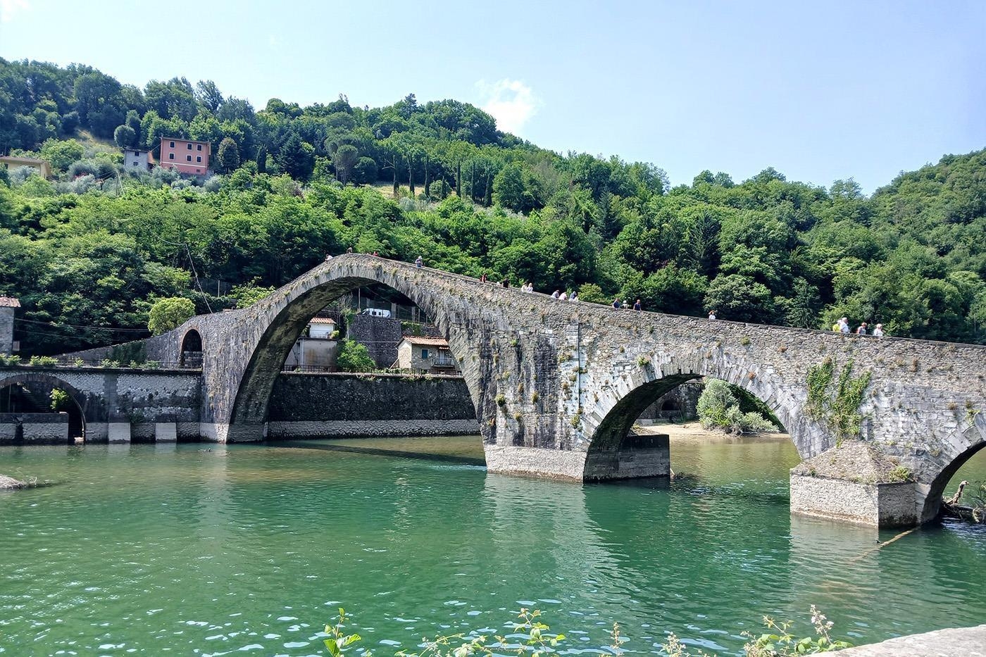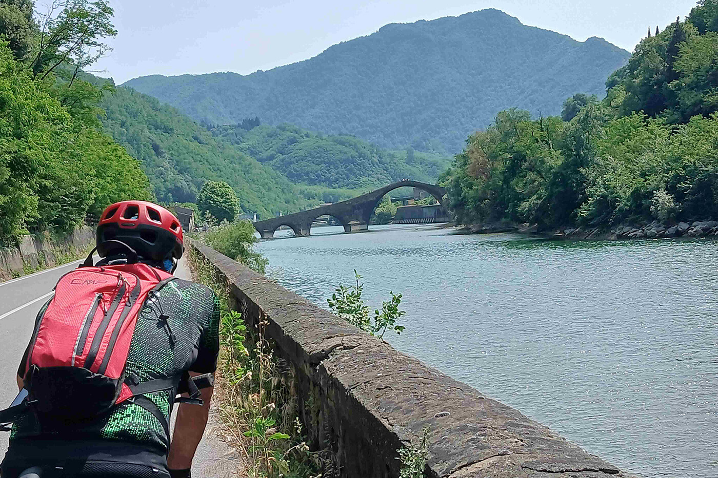 Tilbage på cyklerne går det nedad og igen er cyklerne i deres rette element og med de hydrauliske skivebremser klarer vi nedkørslen i sikker stil. Vi drejer nu skarpt til venstre og kører et par km. til San Cassiano, hvor frokosten venter på byens meget lokale restaurant. Vi får god mad og en lille siesta før vi fortsætter nedkørslen til floddalen og Bagni di Lucca. På vejen tilbage mod hotellet stopper vi ved Ponte della Maddelena også kaldet djævlebroen, som er en intakt middelalderbro der stadig bringer fodgængere til den modsatte bred. Udsigten kan også nydes fra baren hvor vi kan runde dagens tur af. Der er nu kun et par km. til hotellet.