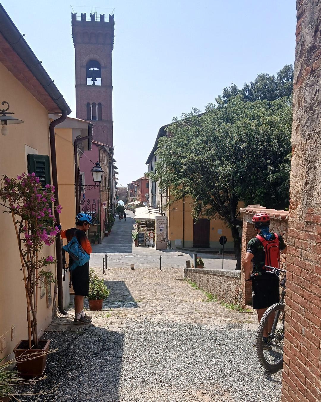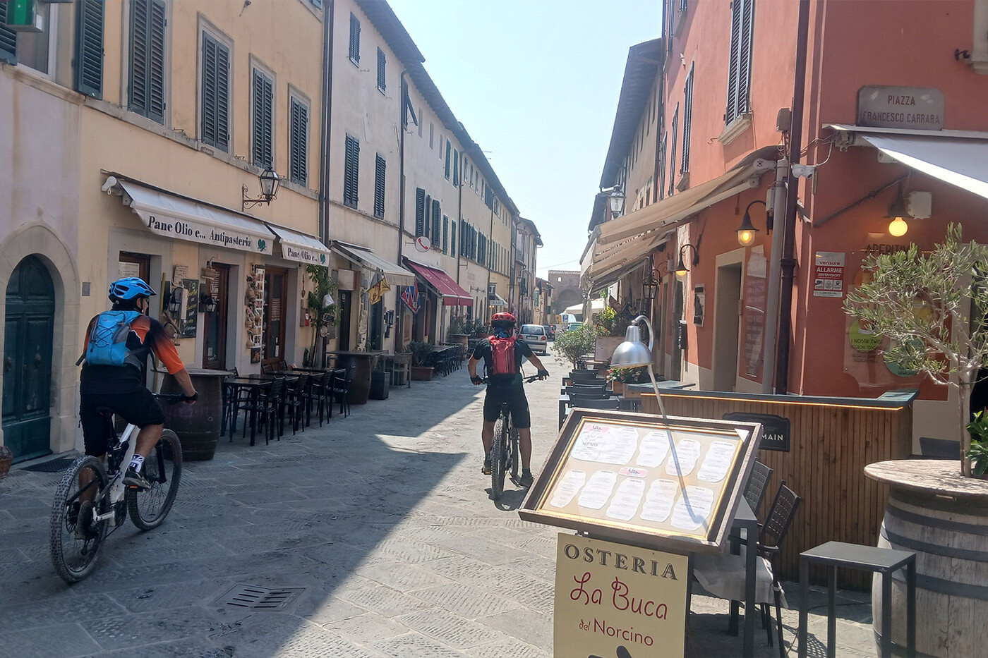 Vel oppe i byen med fæstningen øverst er der tid til at stille cyklerne og gå en tur rundt i den historiske by og supplere med en kaffe. Vi nærmer os nu frokosttid og kører 1,5 km. ned til Fattoria Il Poggio, hvor der produceres vin. Vi har mulighed for en rundvisning, før vi sætter os i skyggen ved det lange bord og nyder en god frokost. Der er også tid til et besøg i butikken, hvor stedets egne produkter sælges. Dagens anden stigning er vejen retur til Montecarlo før det går nedad mod Serciodalen.