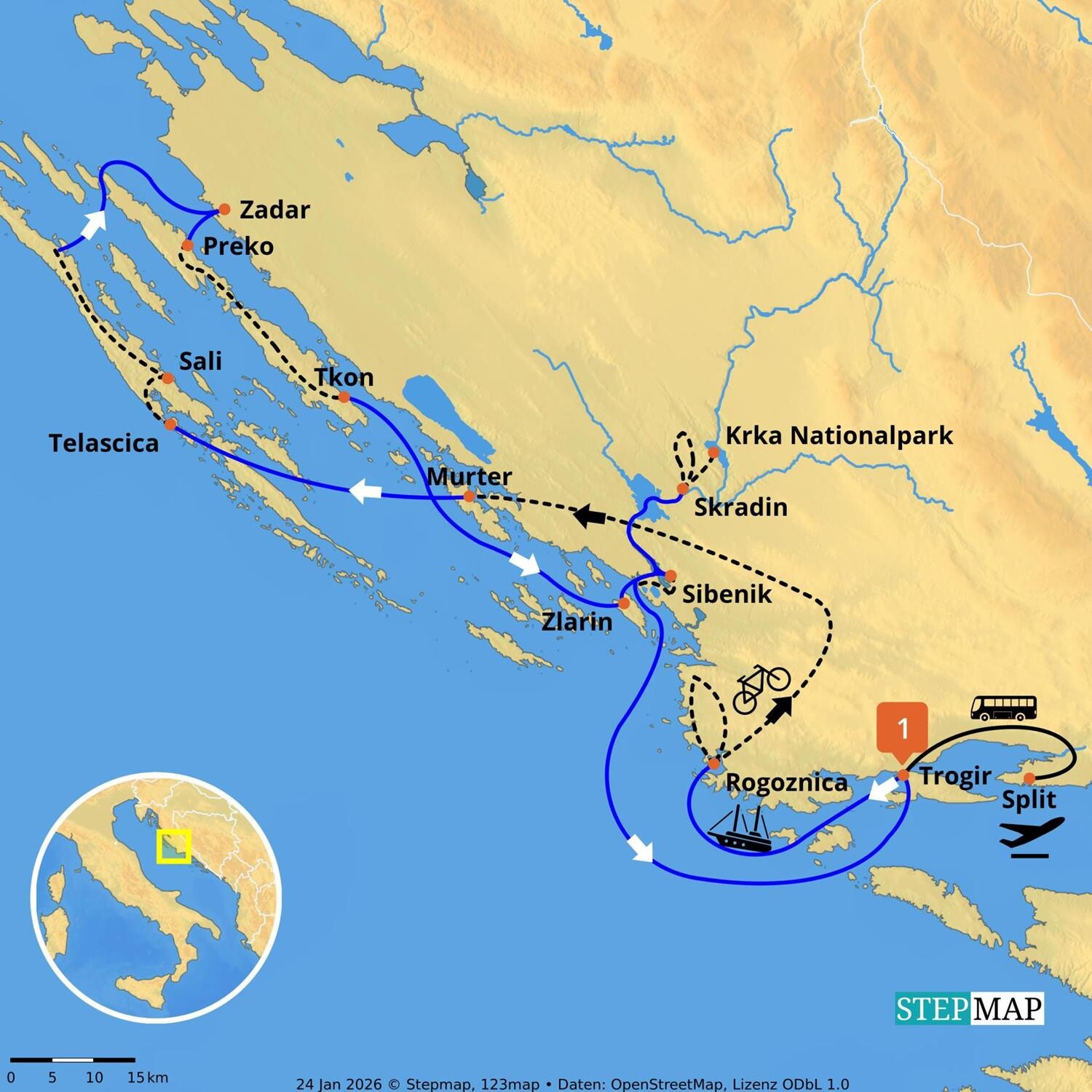 Vi sejler ned af Krka-floden til byen Šibenik, hvor vi enten kan cykle en kort cykeltur på halvøen forbi borgen St. Nicholas ud for Šibenik eller se katedralen og byen. Vi overnatter i den UNESCO-beskyttede og stemningsfulde by Trogir.