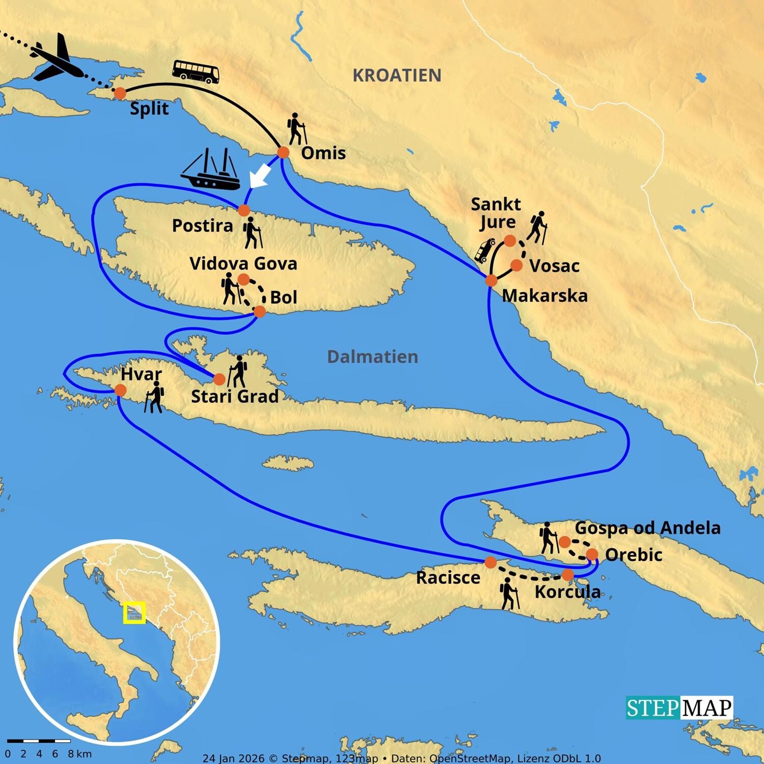 Skibet ankrer op i Dalmatiens idylliske bugter og havnebyer på øerne Brac, Hvar, Korcula og Peljesa. Her venter dig vandreture på frodige øer gennem cypres- og mandeltræslunde, vildtvoksende skove, maleriske kyststrækninger, smukke bjergtoppe og hyggelige kystbyer spækket med historie.