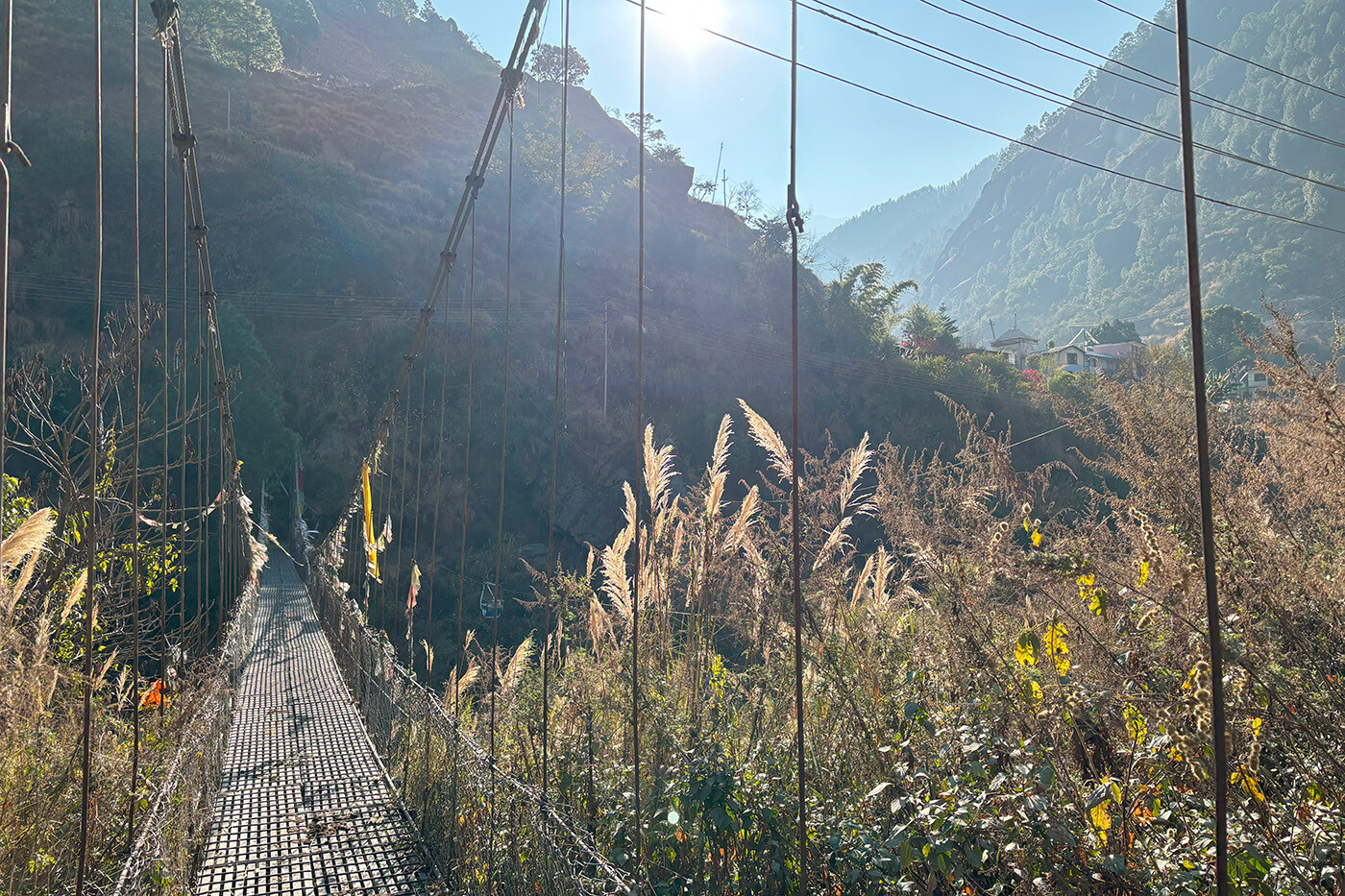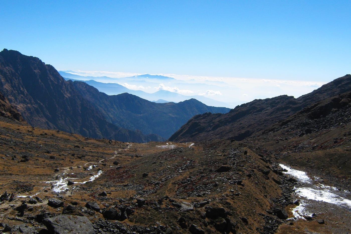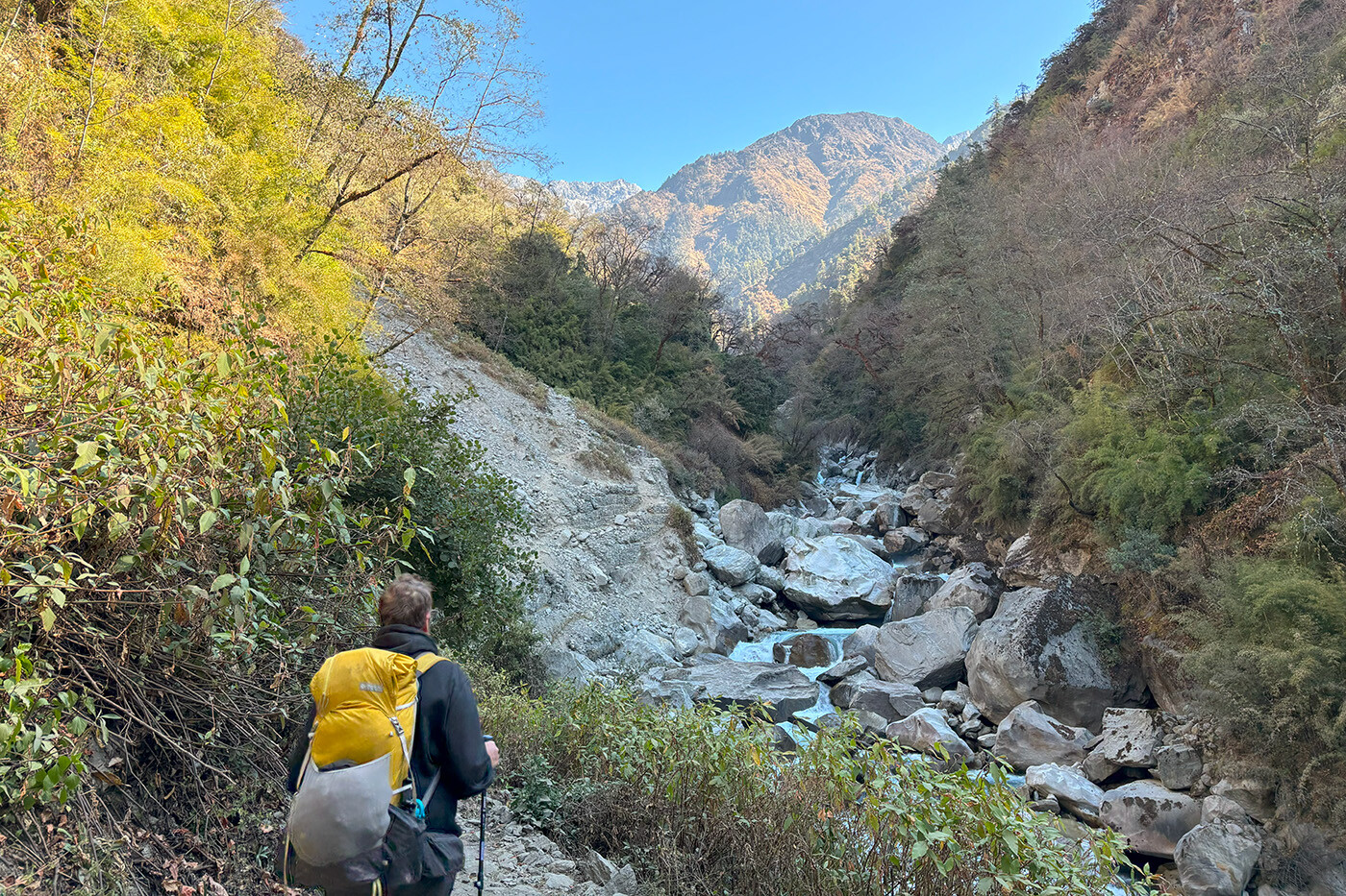 Over de næste par dage skal vi vandre fra Langtang området mod Helambu. Først skal vi tilbage i Langtangdalen og vi har afstandsmæssigt en længere dag foran os. Det går fortrinsvist nedad og med fantastiske udsigter ned i dalen. Og luften bliver langsomt tykkere igen. Vi forlader Kyanjin efter morgenmad og går tilbage ad vores rute ned forbi Mundu, over Langtangs moræne til Ghora Tabela. På vej tilbage i skoven tager vi stien ned i dalen gennem Chhunuma og Riverside tilbage til Lama Hotel, hvor vi overnatter på i et primitivt tehus i skoven.
