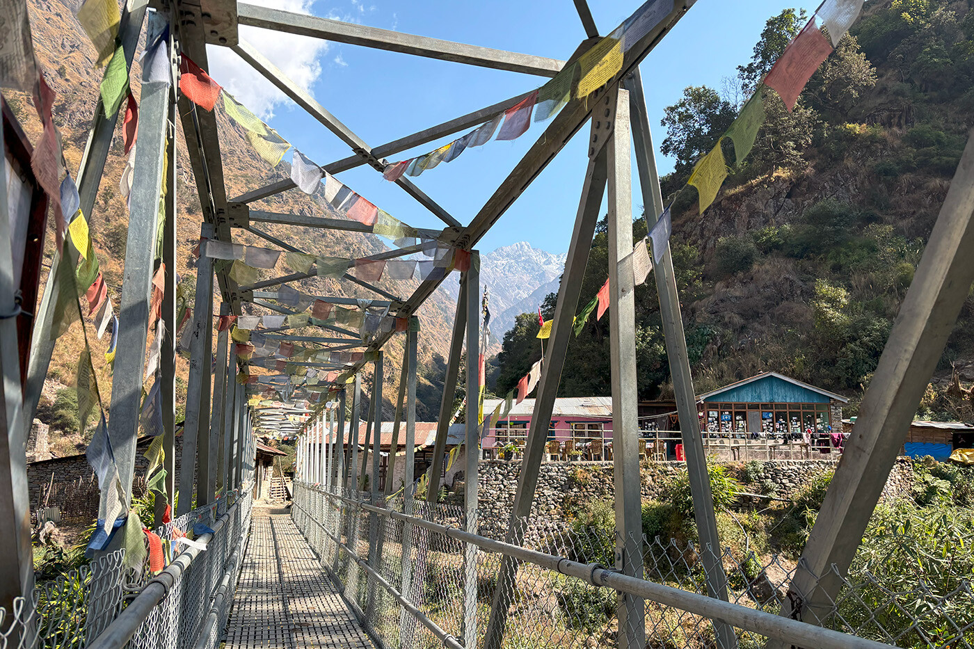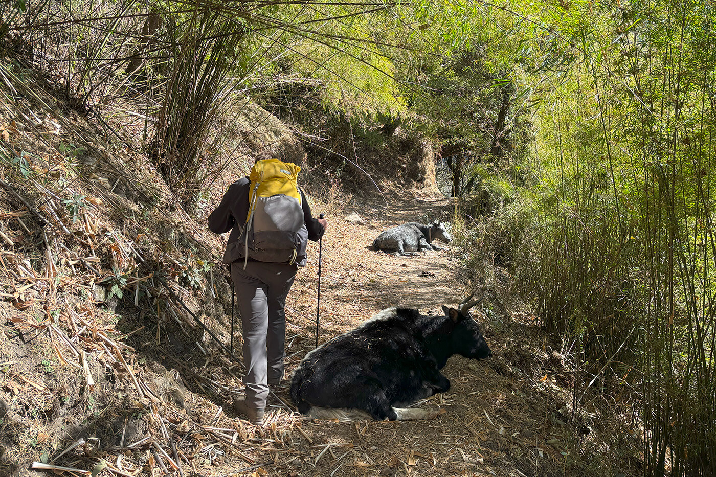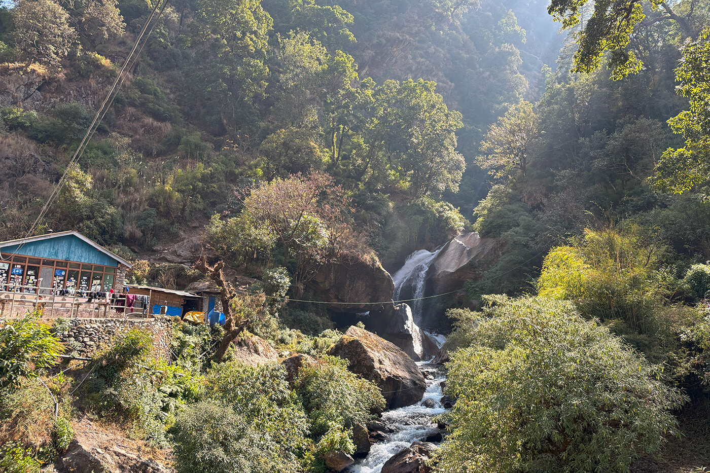 Over de næste par dage skal vi vandre fra Langtang området mod Helambu. Først skal vi tilbage i Langtangdalen og vi har afstandsmæssigt en længere dag foran os. Det går fortrinsvist nedad og med fantastiske udsigter ned i dalen. Og luften bliver langsomt tykkere igen. Vi forlader Kyanjin efter morgenmad og går tilbage ad vores rute ned forbi Mundu, over Langtangs moræne til Ghora Tabela. På vej tilbage i skoven tager vi stien ned i dalen gennem Chhunuma og Riverside tilbage til Lama Hotel, hvor vi overnatter på i et primitivt tehus i skoven.