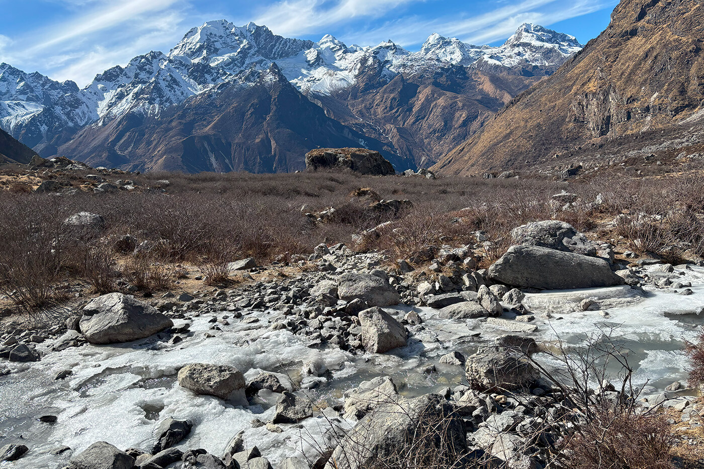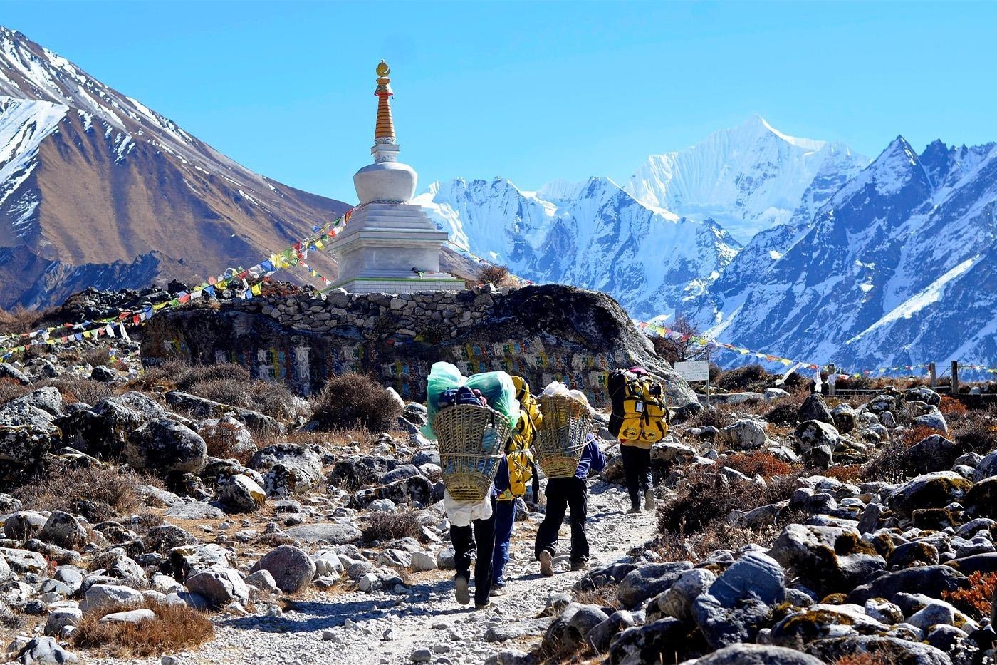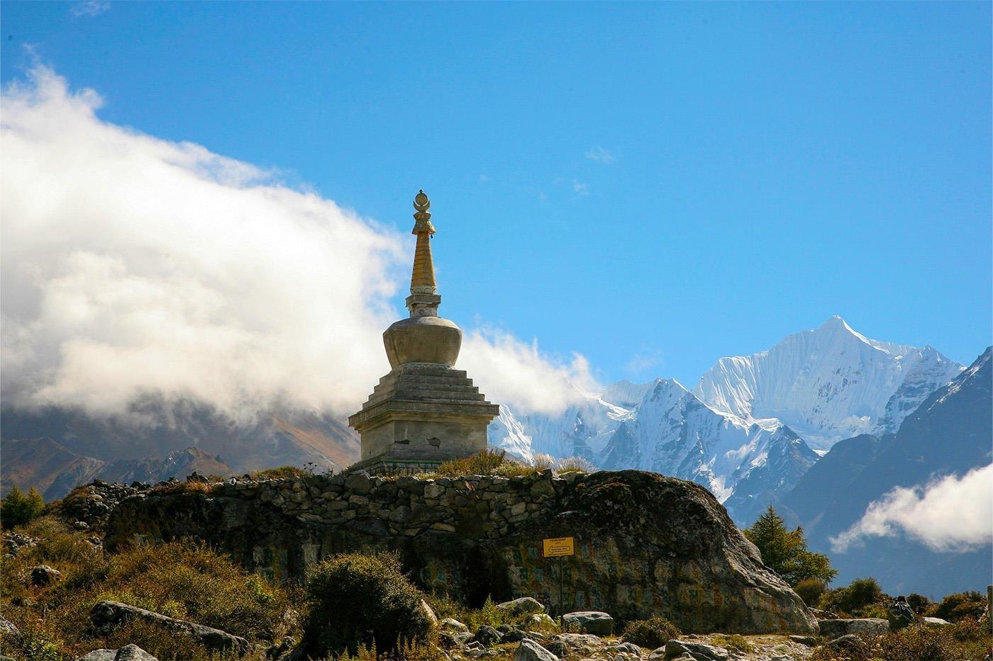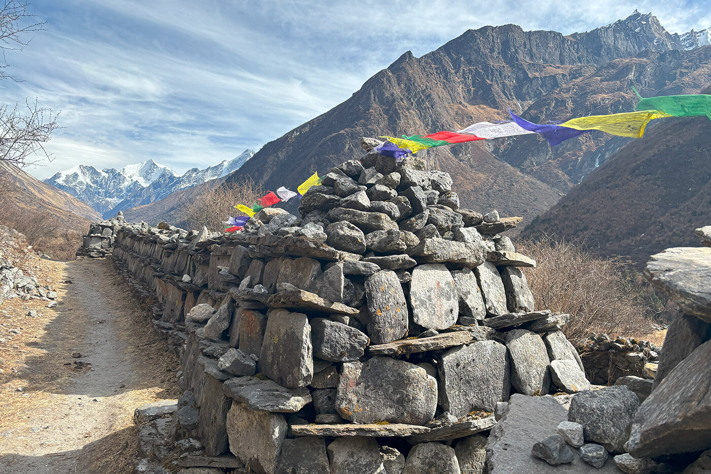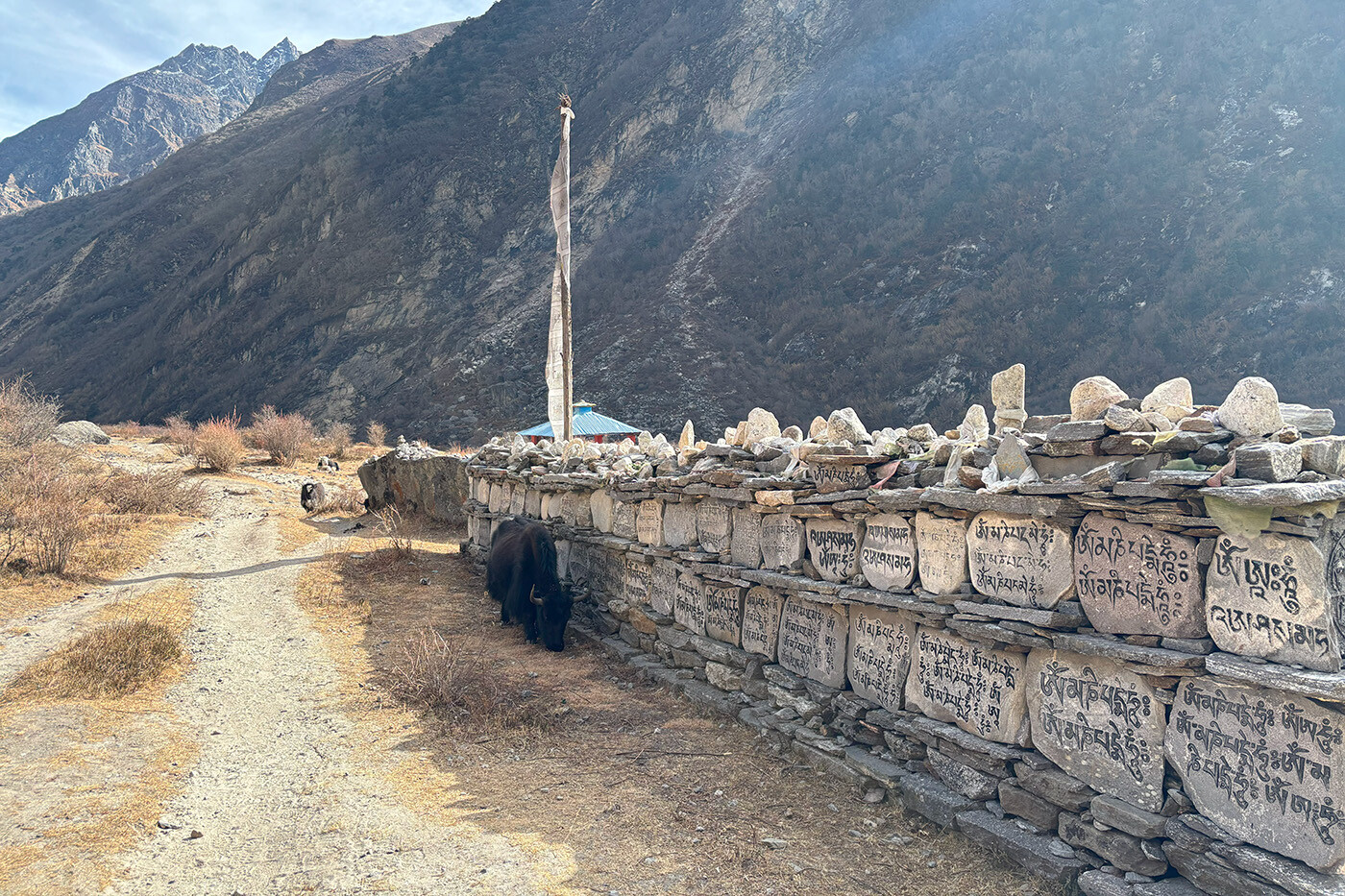 Dalen åbner sig mere og mere i takt med at vi stiger op igennem Langtang dalen. Stien passerer Thangshyap, og efter et stykke tid, kommer vi til den store moræne af sten og grus, der engang var Langtang. Denne landsby, den største i distriktet, blev ødelagt i jordskælvet i 2015 og blev dækket af sten og is. En sti fører nu over morænen, og det er en gribende påmindelse om naturens kraft. Samtidig er det et stærkt argument for at besøge netop Langtang, da al støtte og økonomi til de lokale tjener et yderst godt formål. På den anden side af morænen kommer vi til et par nybyggede tehuse og et mindesmærke for dem, der mistede livet i denne dal i jordskælvet. Efter den lille bebyggelse Mundo, åbner dalen sig fuldt og afslører en spektakulær udsigt over bjergene. Til venstre for os tårner den imponerende bjergmassiv, Langtang Lirung, sig op over os. Foran ligger den store snedækkede masse af Mt. Ganchempo. Vi stiger kontinuerligt og passerer ’mani-walls’, såkaldte bedevægge, med ældgamle sten, indtil vi kommer til Kyanjin Gompa i 3.880 m. Engang var der kun en lille ostefabrik her. Nu er det et travlt sted med mange tehuse.