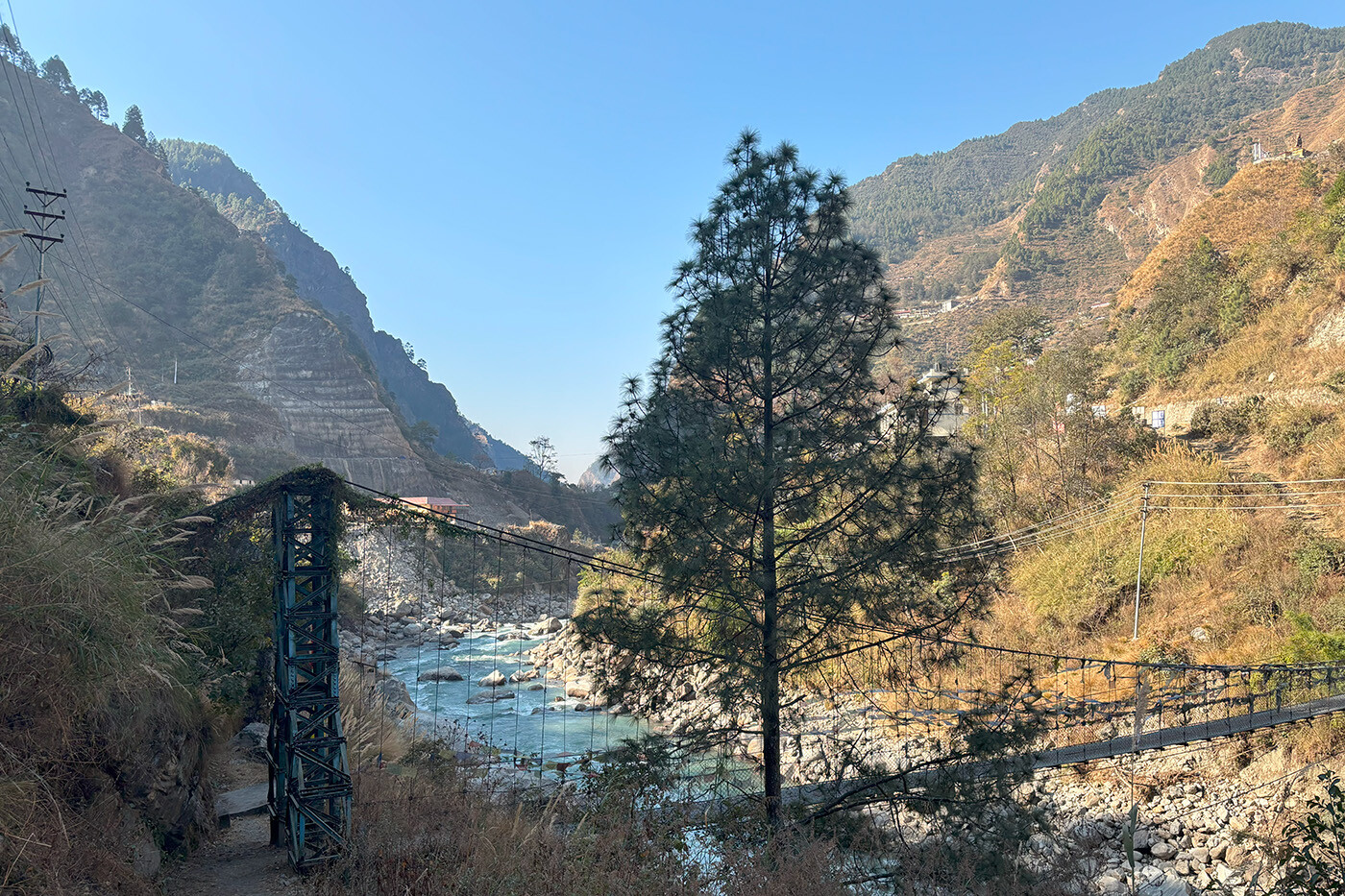 Kort efter Lama Hotel deler stien sig. Vi drejer til venstre og rammer en lidt ujævn, stenet og smal sti, der fører os stejlt ned til floden og en bro over Langtang Khola. Herfra bølger stien gennem skoven til bambus og videre til Pairo i 1.700 m, hvor vi spiser frokost på et lokalt tehus. Derefter forlader vi floden og stiger stejlt en times tid, til vi rammer en lille te-shop længere oppe i skoven. Herfra traverserer stien rundt i en side dal og falder for at krydse floden via en bro. Og derefter venter en anden stejl stigning op til Thulu Syabru, en landsby, der strækker sig over en højderyg på 2.250 m. Herfra er der fantastisk udsigt til Langtang-dalen og bag landsbyens huse, kan vi på en klar dag se bjergkæden, Ganesh Himal.