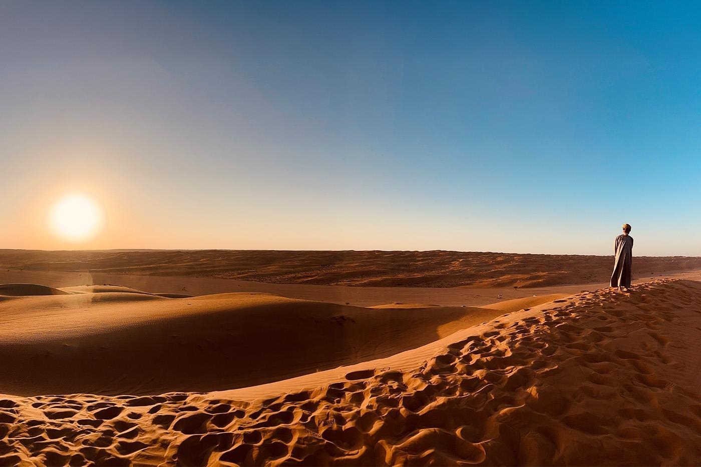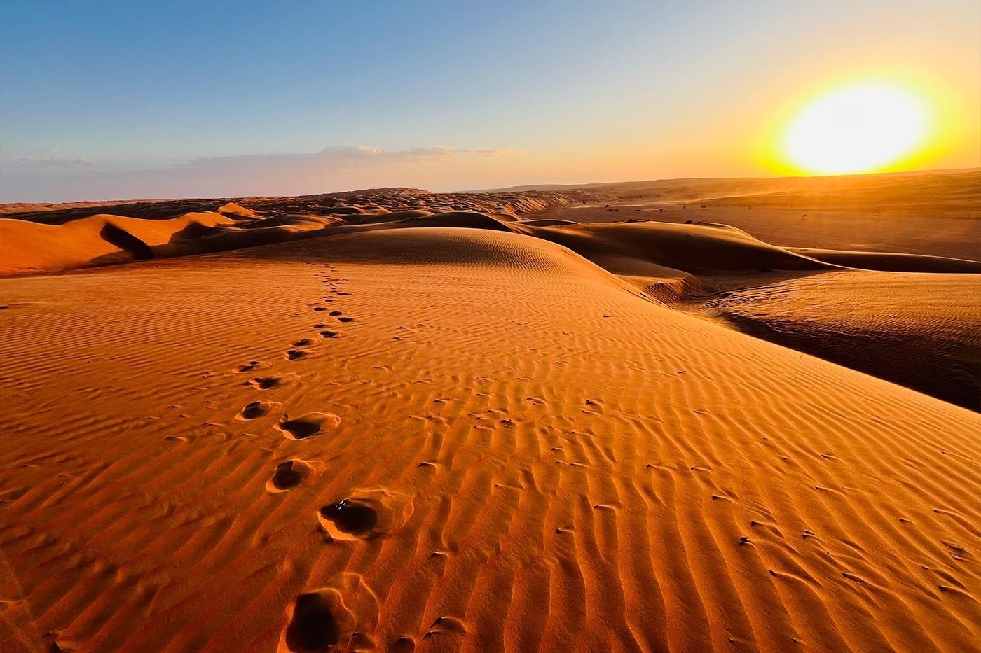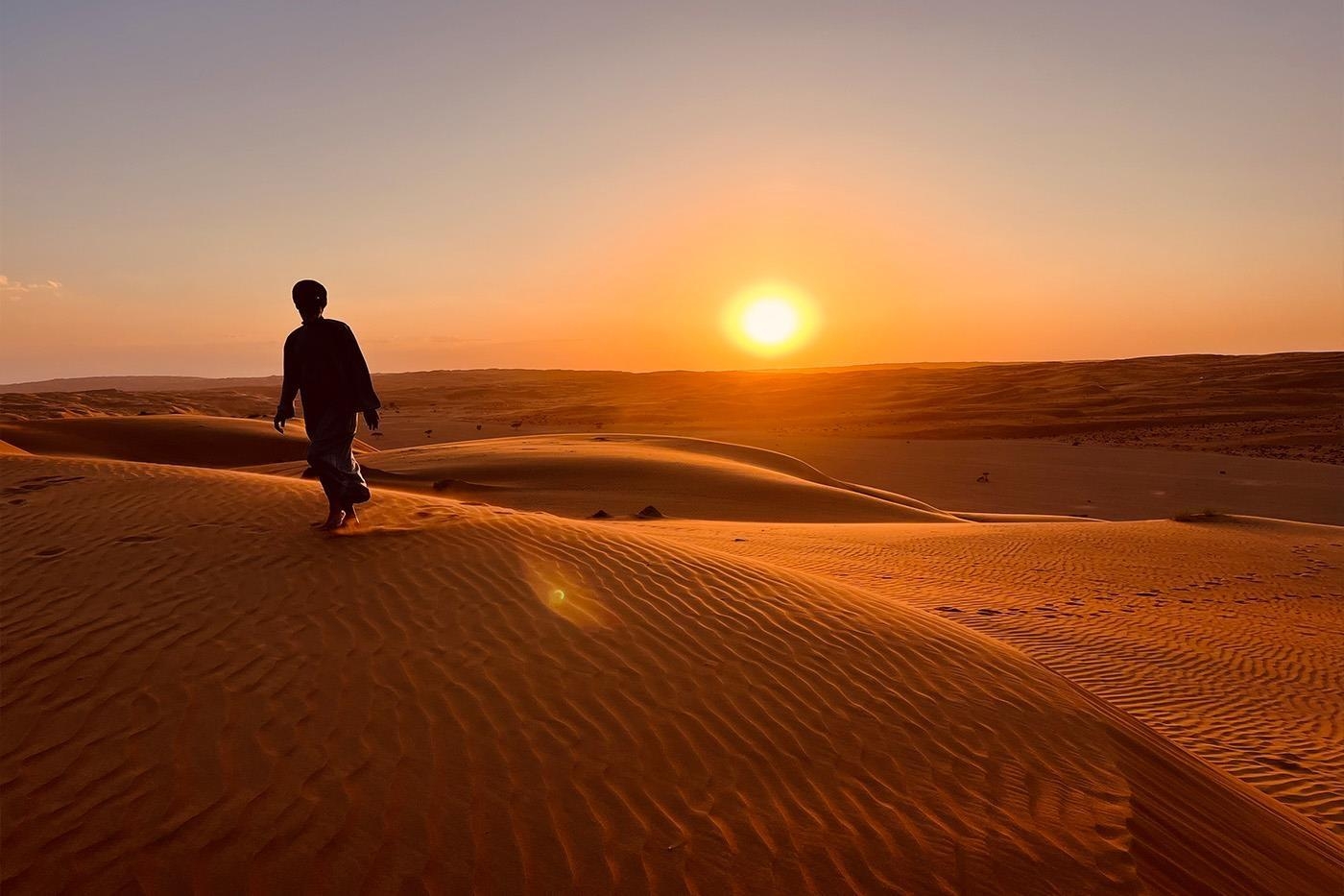 Magiske øjeblikke venter i Wahiba-ørkenen, når solen går ned over sanddynerne og farver de endeløse sandsletter røde og gyldne. Om aftenen sætter vi os sammen omkring et knitrende bål under en stjernespækket himmel, mens vi om morgenen nyder det sjældne privilegium at vågne til lyden af ingenting.