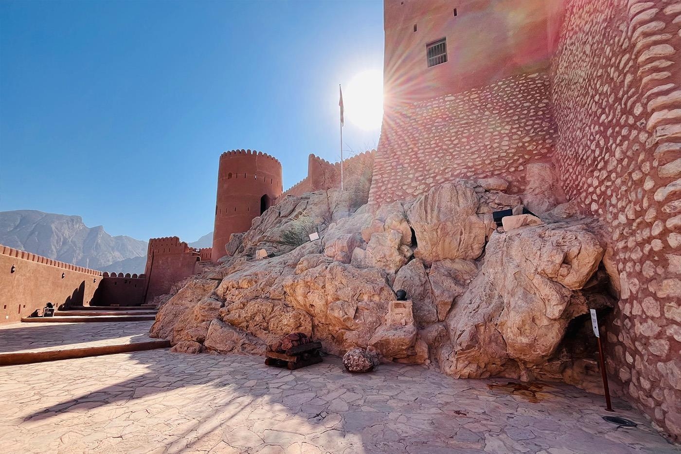 Herefter fortsætter vi mod Nakhal Fort, som ligger smukt og højthævet med daddelpalmer hele vejen rundt. Vores lokale guide fortæller om fortets histori, der dateres tilbage til før-islam. Ikke langt fra Nakhal Fort ligger Ain Al Thowarah, som er et lille, varmt kildeudspring. Stedet er hverken stort eller prangende, men vi gør alligevel holdt, og det er muligt at sænke ømme fødder ned i floden og få en naturlig og gratis pedicure. De små fisk strømmer nemlig til og giver sig til at nippe af huden på fødderne.