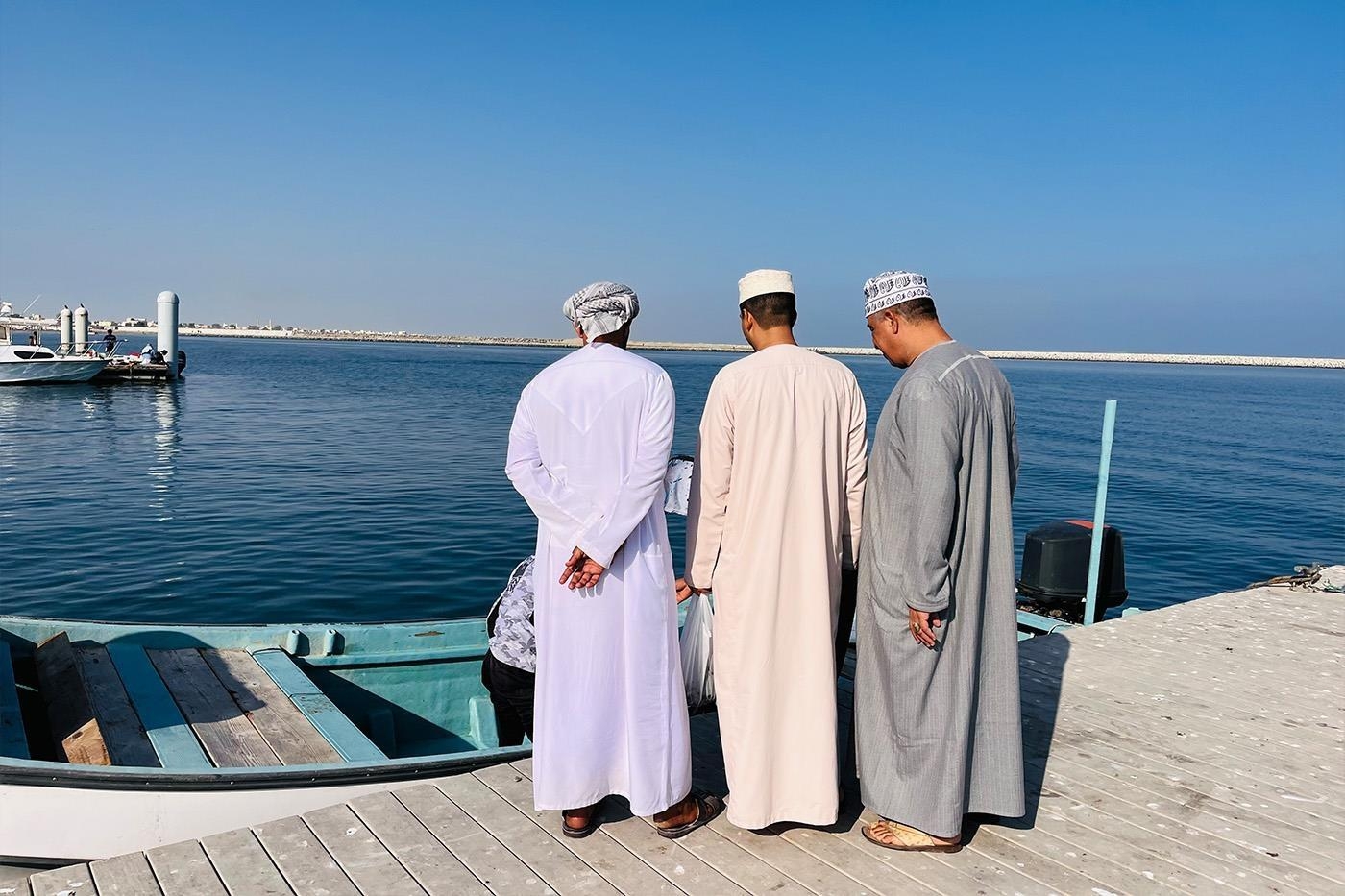 Vi kører nordpå og efter en times kørsel drejer vi fra hovedvejen mod den lille kystby, Barka. Her kommer lokale fiskere hver morgen ind med friskfangede fisk, og vi overværer, hvordan de lokale handler, sommetider på fiskeauktion. Hvis vi er heldige, kan vi se store havskildpadder i det klare vand på molen.