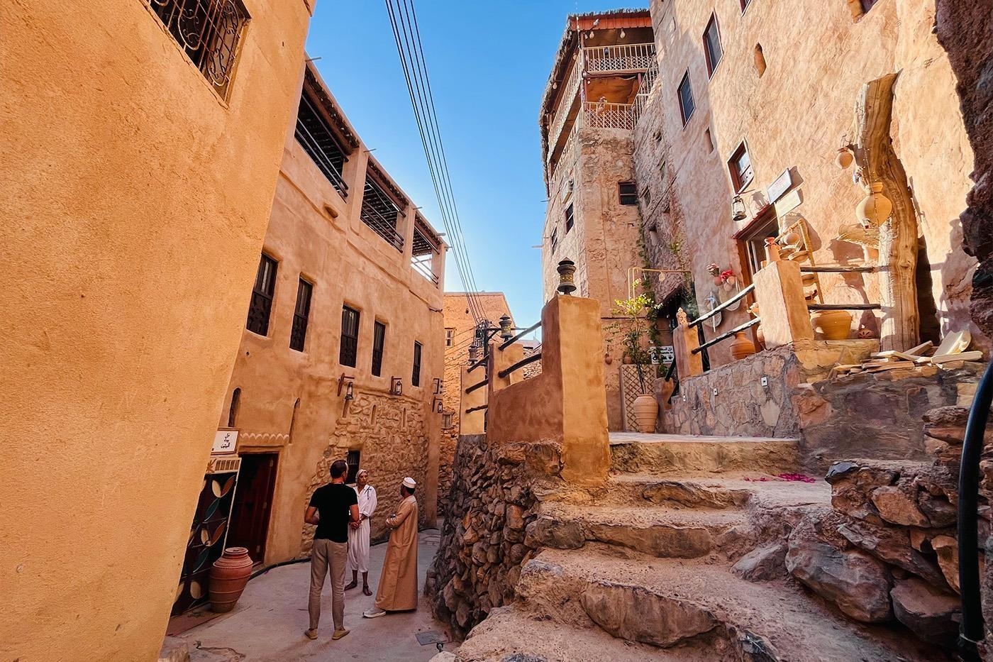 Tilbage på asfalteret vej ryster vi støvet af os og besøger den populære landsby, Misfat Al Abriyeen. Her vandrer vi en lille tur på cirka en times tid, som giver os indblik i lokallivet og afgrøderne, der dyrkes i området. Vi har udsyn til terrassemarkerne, vandingskanalerne og grønne dadelpalmetræer. Den selvbetalte frokost spises, hvis der er stemning for det, i et af de traditionelle omanske huse. Om eftermiddagen fortsætter vi til Al Hamra, som er en af Omans ældste mudder-huse, og som er kendt for netop sin arkitektur. Vi besøger landsbyens museum, et slags frilandsmuseum, hvor vi på en guidet rundtur får indblik i Omans historie og omanernes levevis.