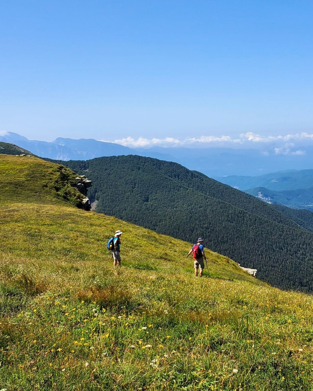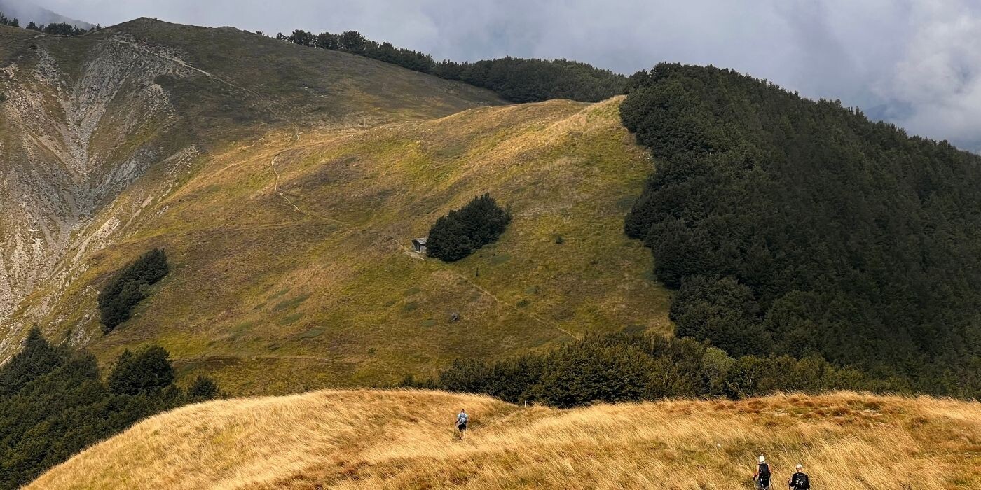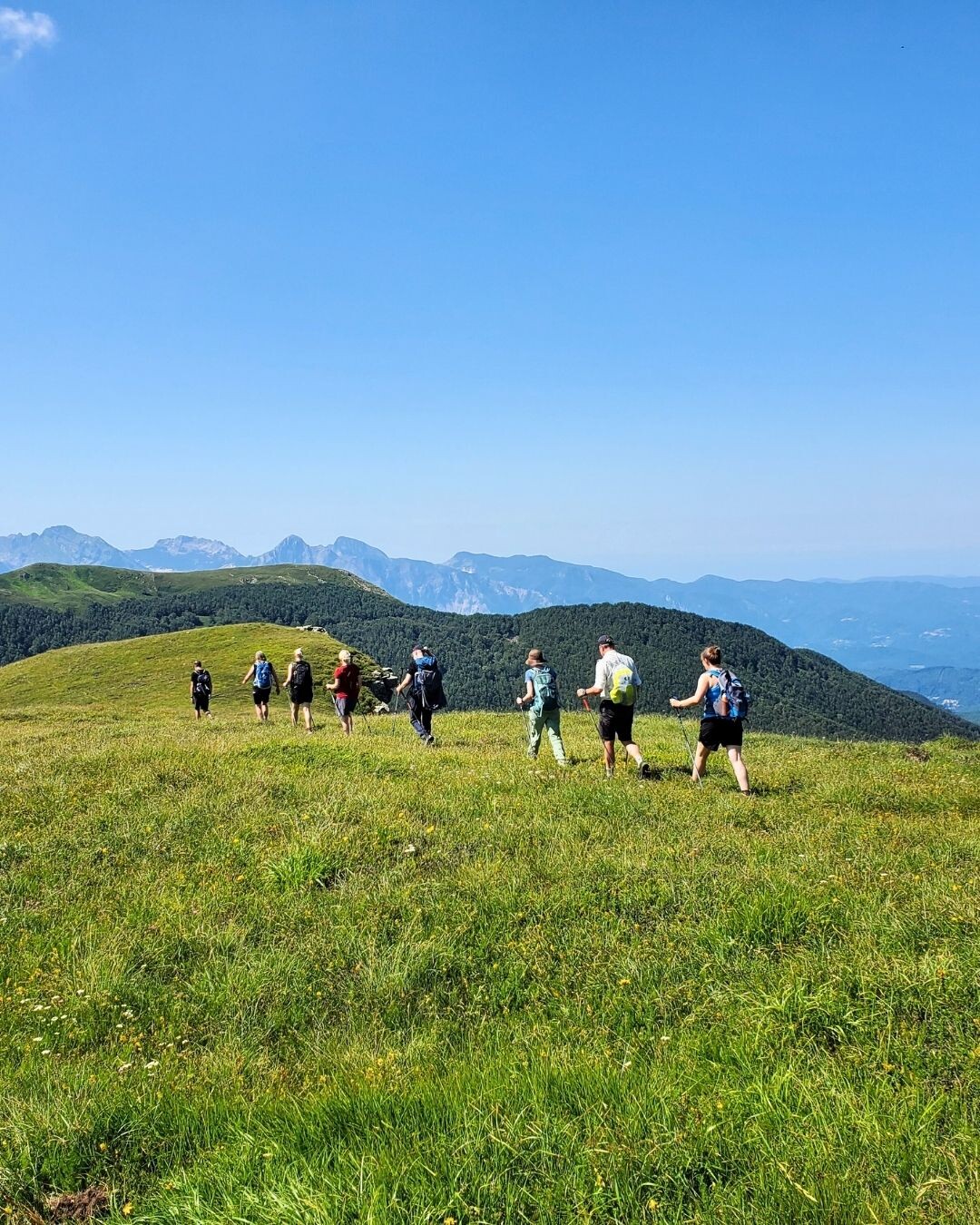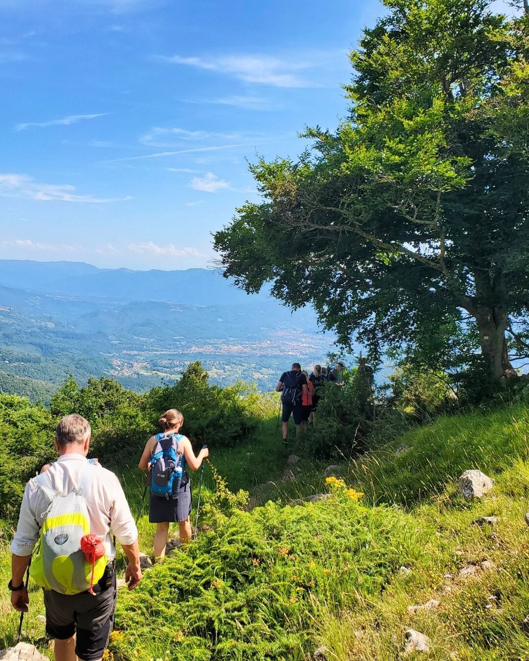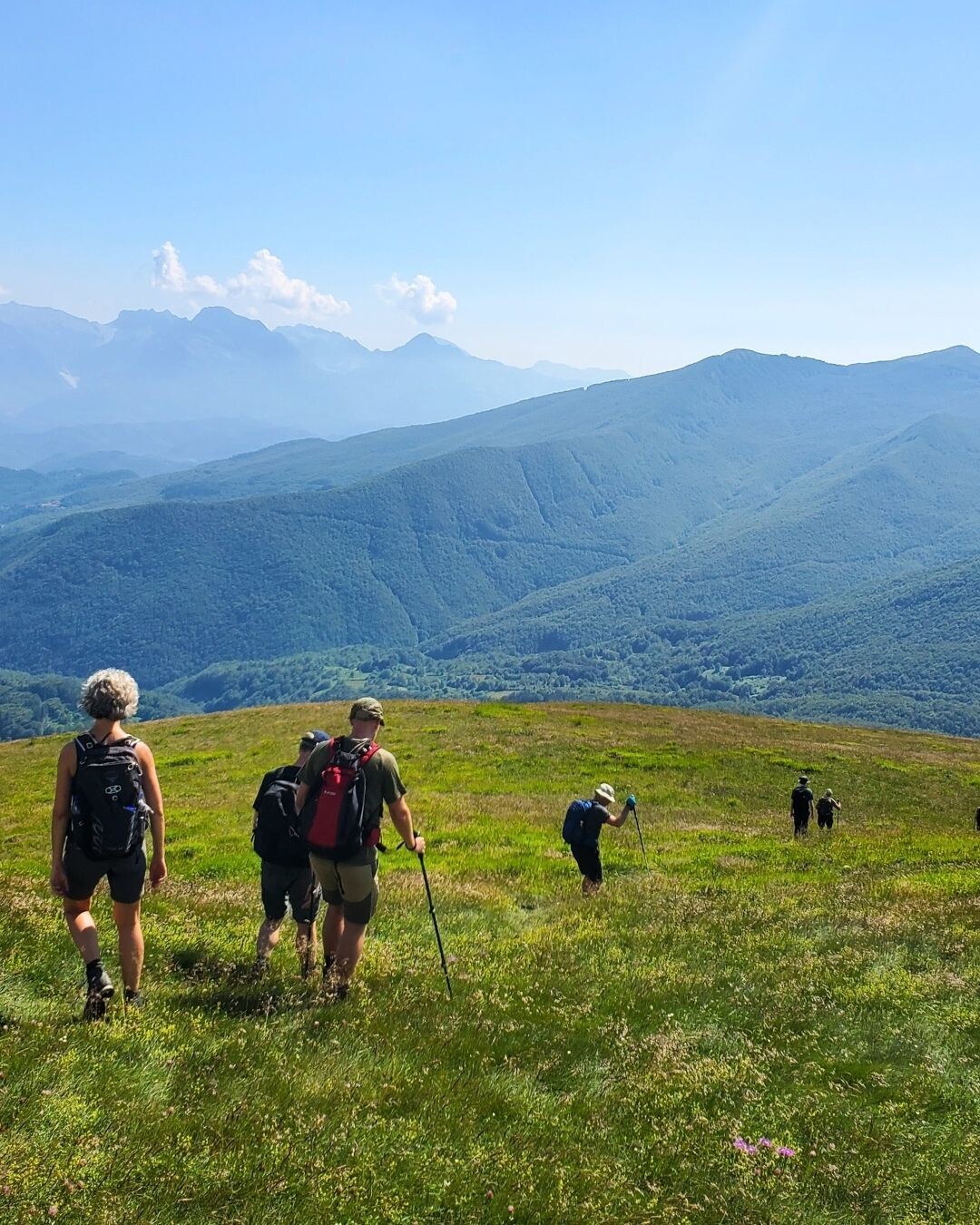 Vi vandrer mest over vegetationsgrænsen langs en smuk og udsigtsrig bjergkam og kigger ud over store grønne skove, som danner en smuk kontrast til de lyse kalkbjerge, Alpi Apuane i horisonten.