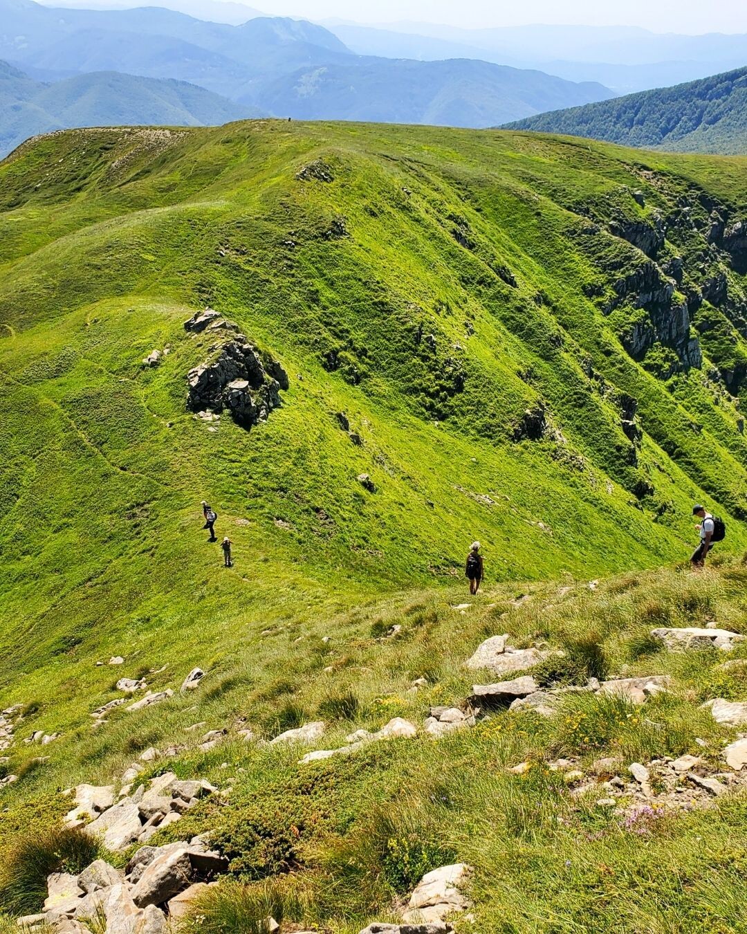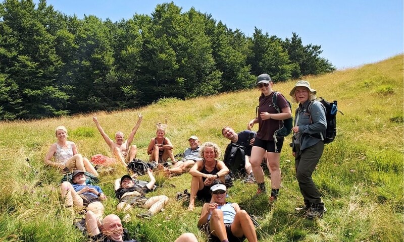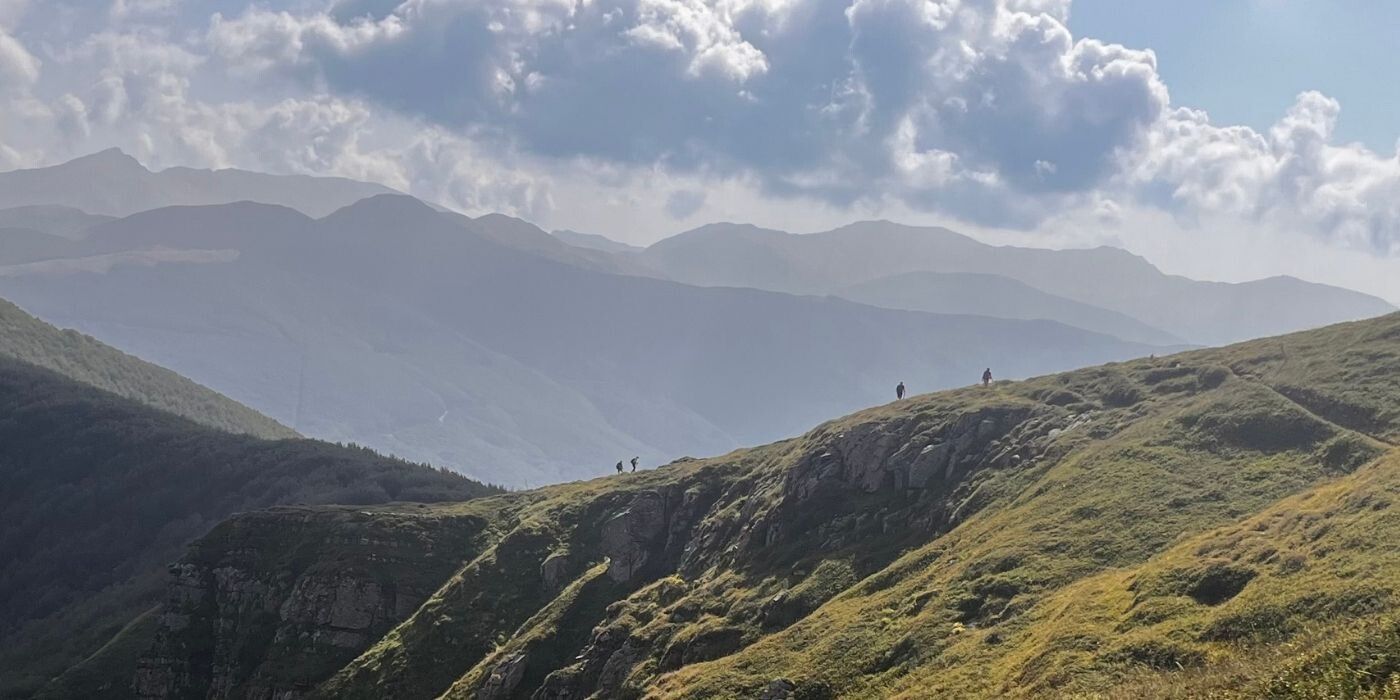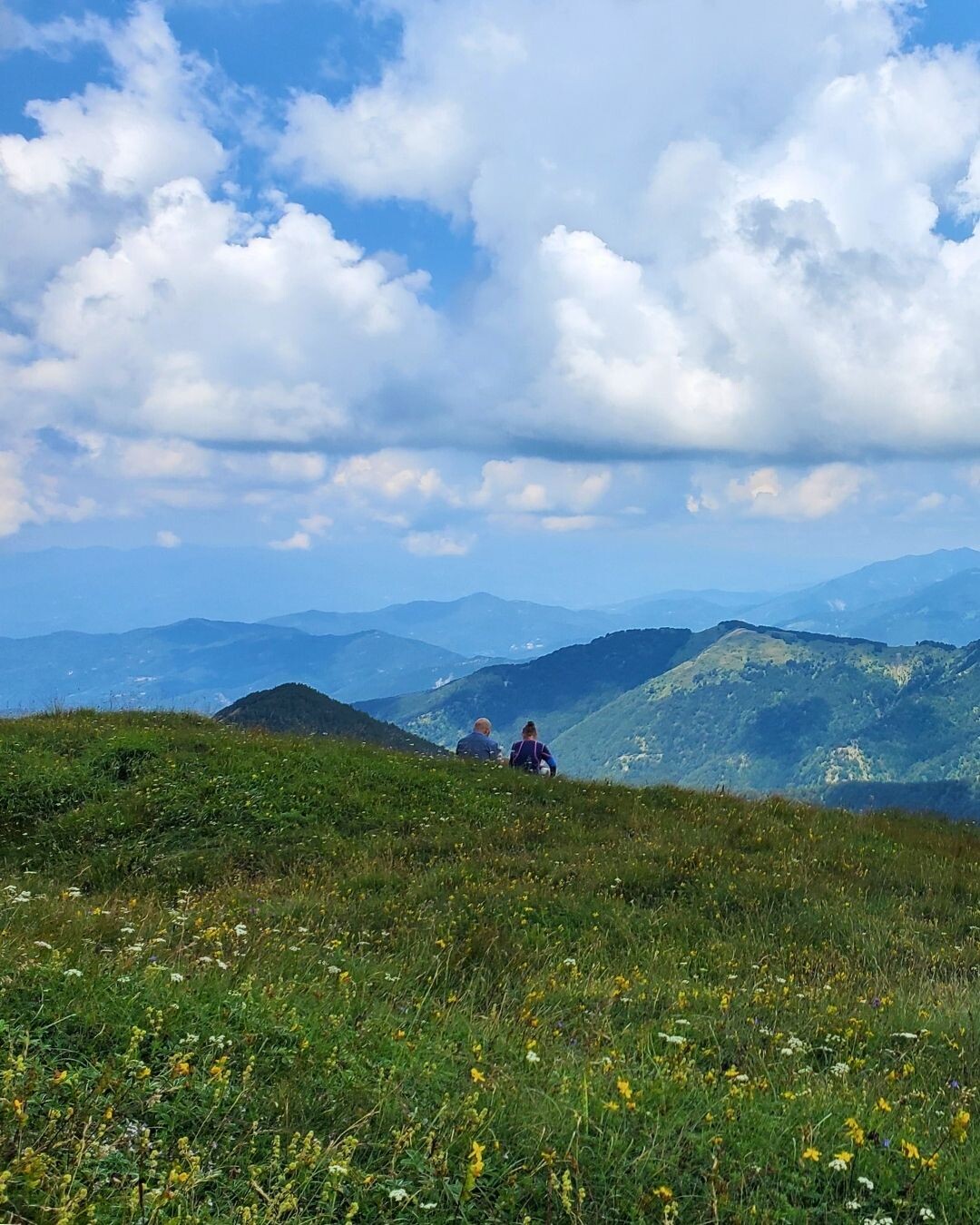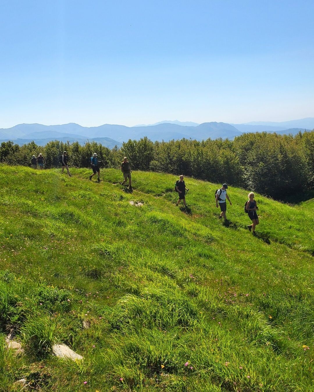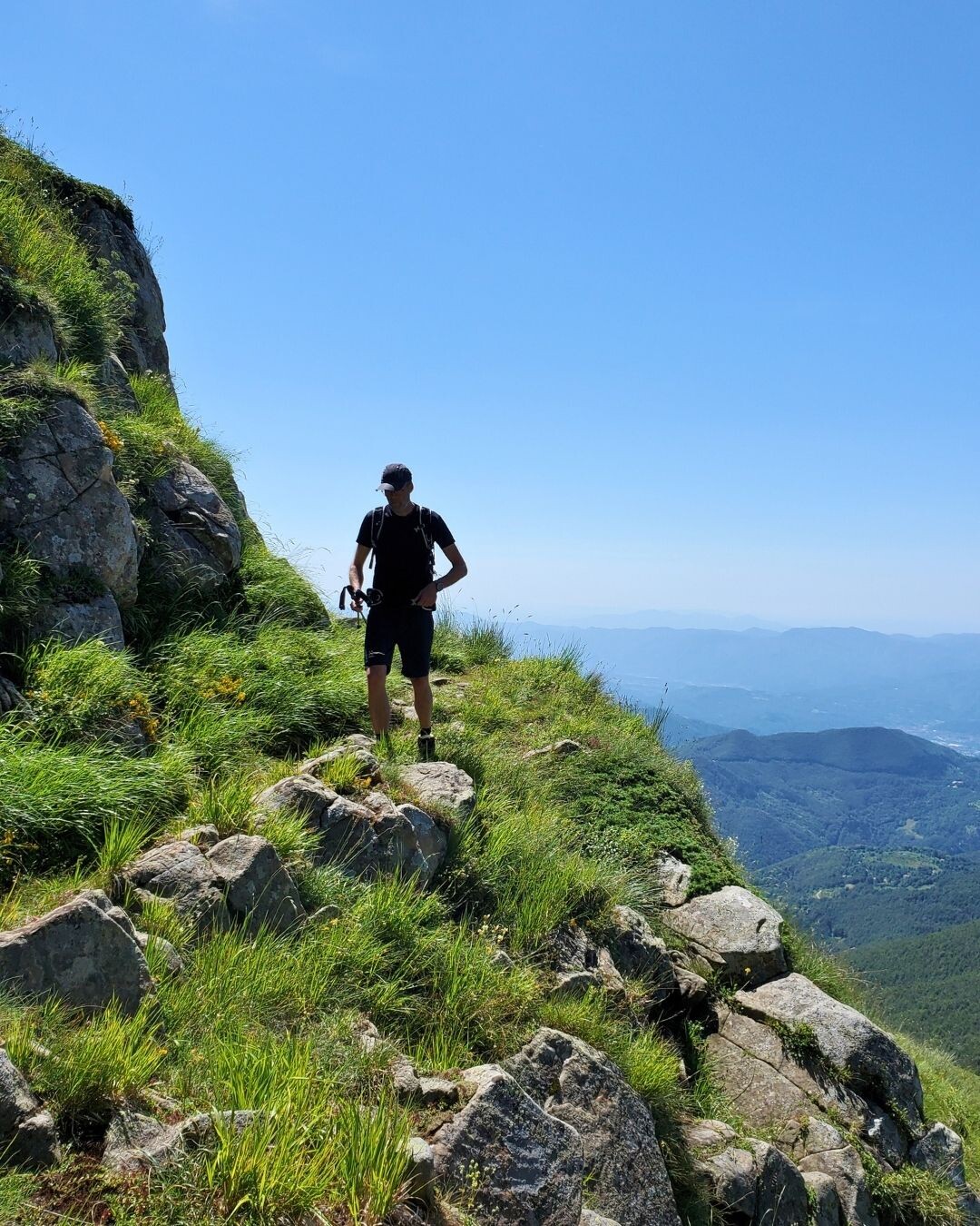 Vi vandrer mest over vegetationsgrænsen langs en smuk og udsigtsrig bjergkam og kigger ud over store grønne skove, som danner en smuk kontrast til de lyse kalkbjerge, Alpi Apuane i horisonten.