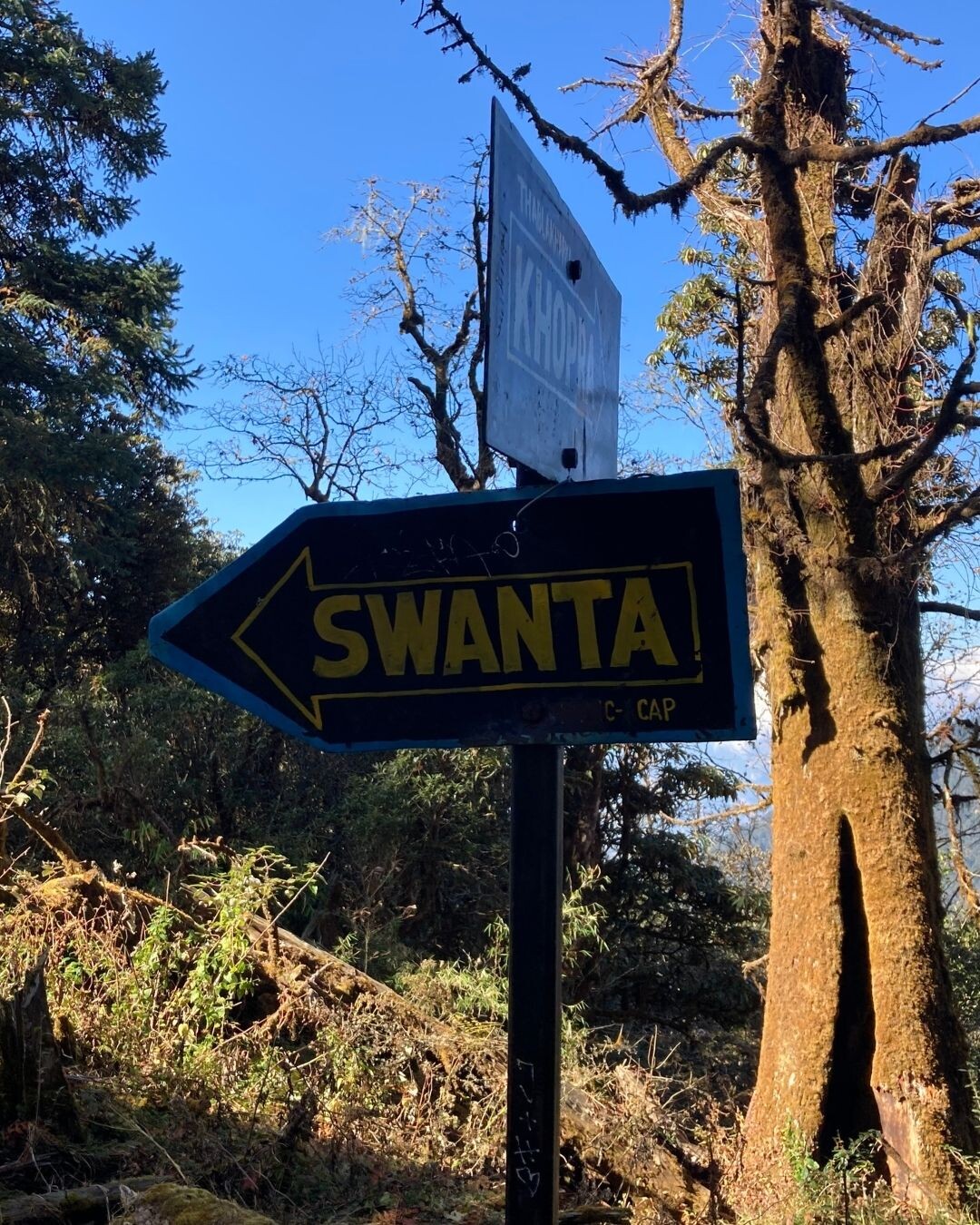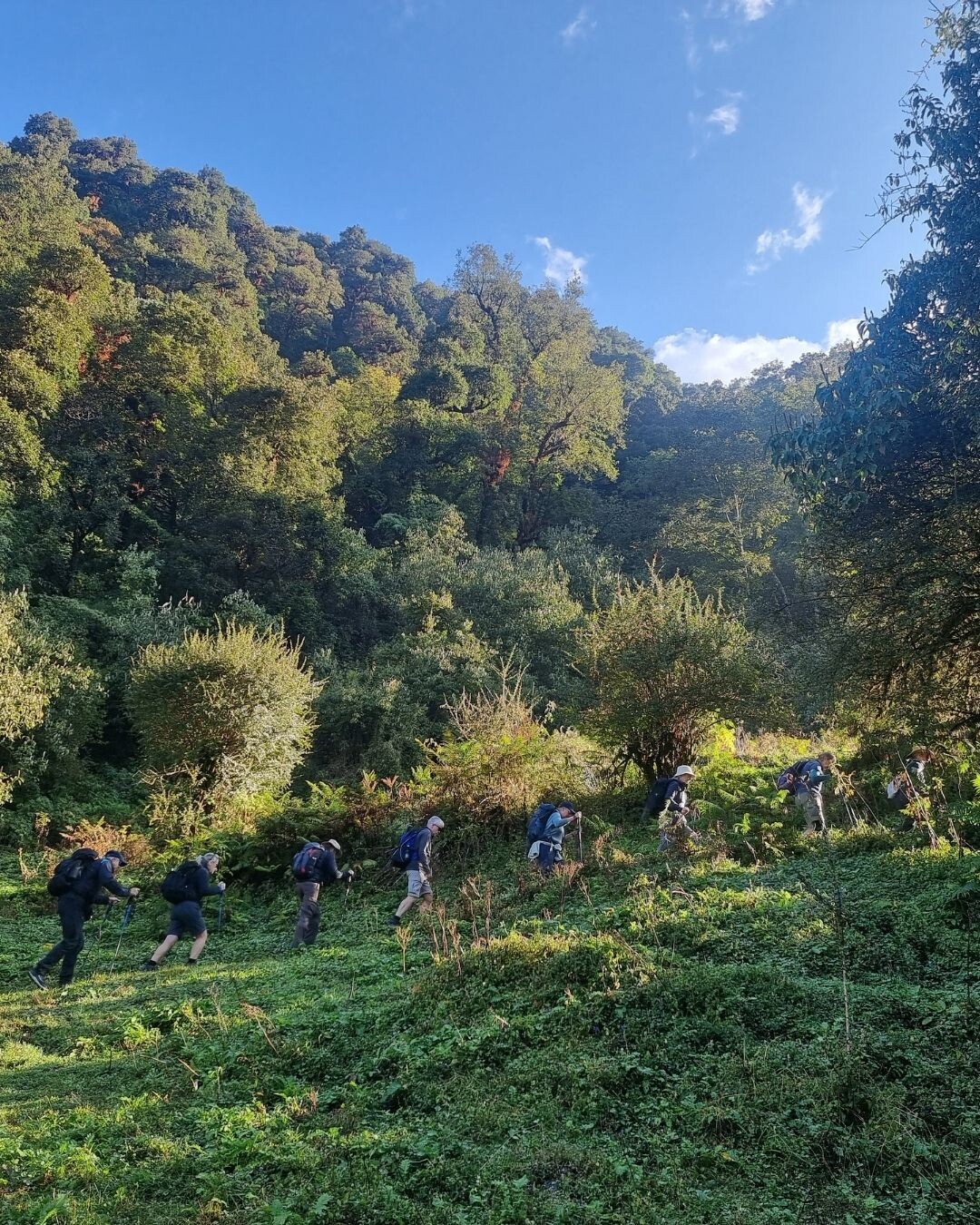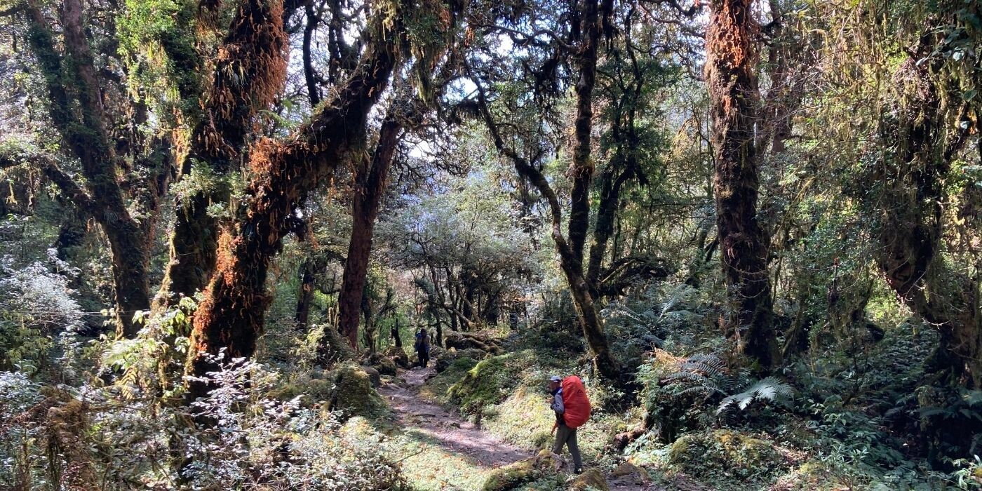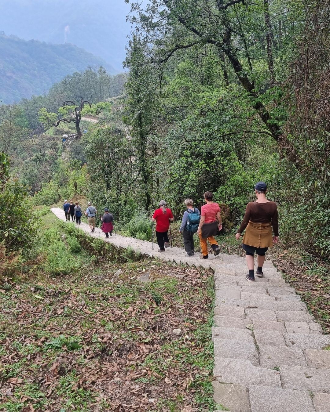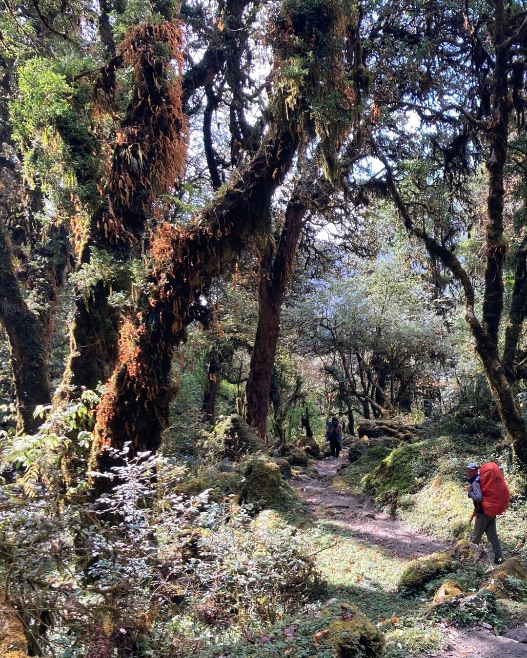 - Fra kanten af skoven ved Bhantanti i 2.250 m. fortsætter stien ind i et meget smukt område med skov — op til 15 meter høje rododendrontræer, små vandfald og en tæt underskov af bl.a. bambus.