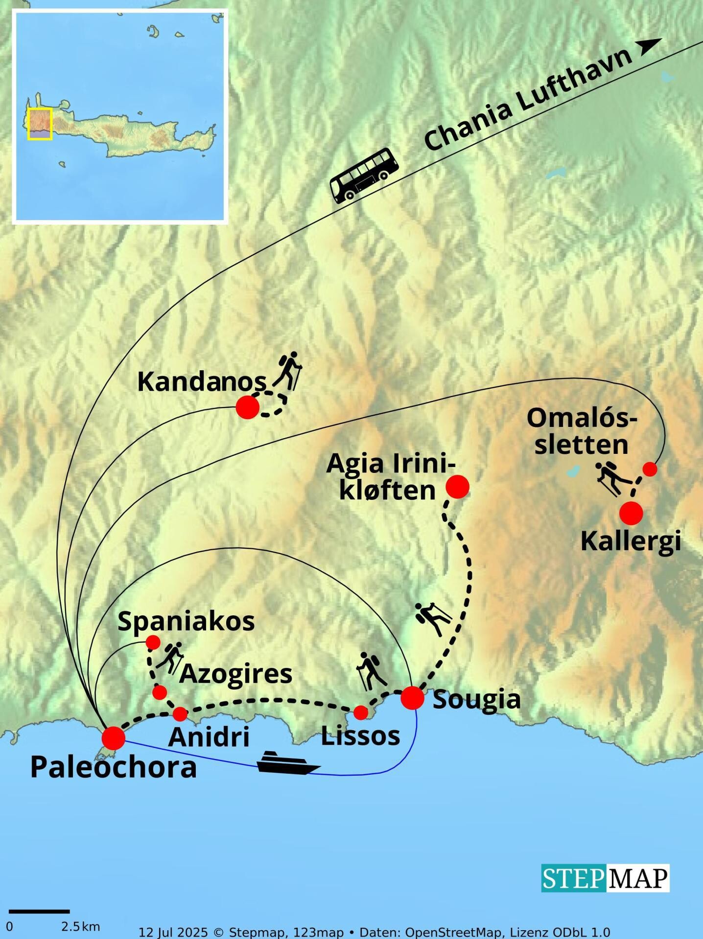 På turens dag 4 og 6 tager vi i udgangspunkt færgen om morgenen fra Paleochora til Sougia. Sejlads med færgen er dog meget vejrbestemt, da den kun sejler i rolige vejrforhold. Det ligger heller ikke helt fast, hvornår færgen begynder at operere i foråret eller hvornår den stopper i efteråret. Sejler færgen ikke af den ene eller anden årsag, køres der i stedet i bus til Sougia.