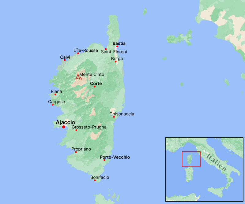 Når man kigger på et kort, findes Korsika vest for den italienske halvø og direkte nord for Sardinien. Øens største by og hovedstad er Ajaccio. Korsika er en del af Frankrig, men ligger 170 km syd for fastlandet. Kortet ovenfor viser de største byer på Korsika.